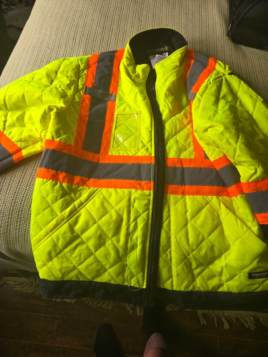 High-visibility quilted jacket. Features reflective strips. Zipper closure. Size XXL. Excellent condition.