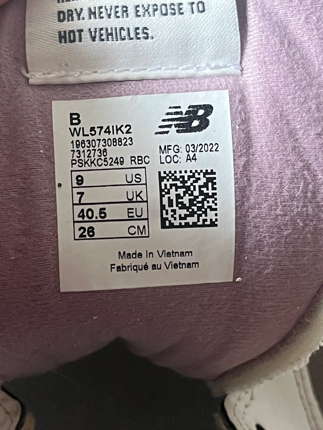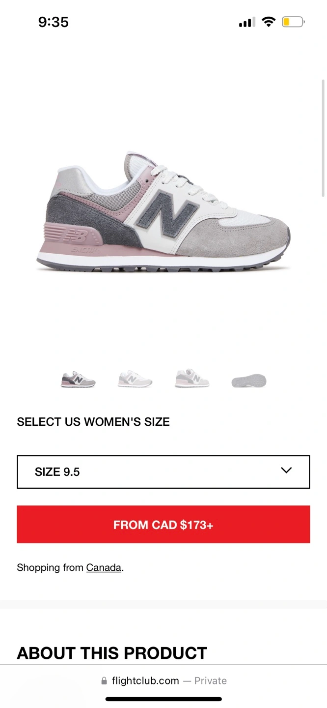 Women's New Balance 574 sneakers. Size 9.5. Grey, white, and mauve colour scheme. Classic style.