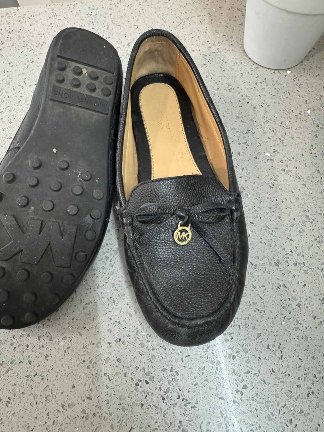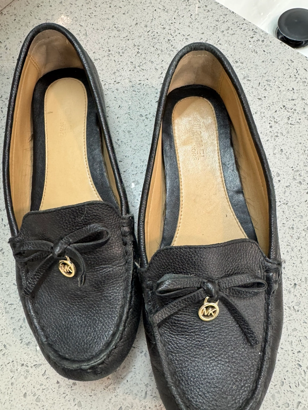 Women's black leather loafers. Bow detail and gold MK logo. Pre-owned.