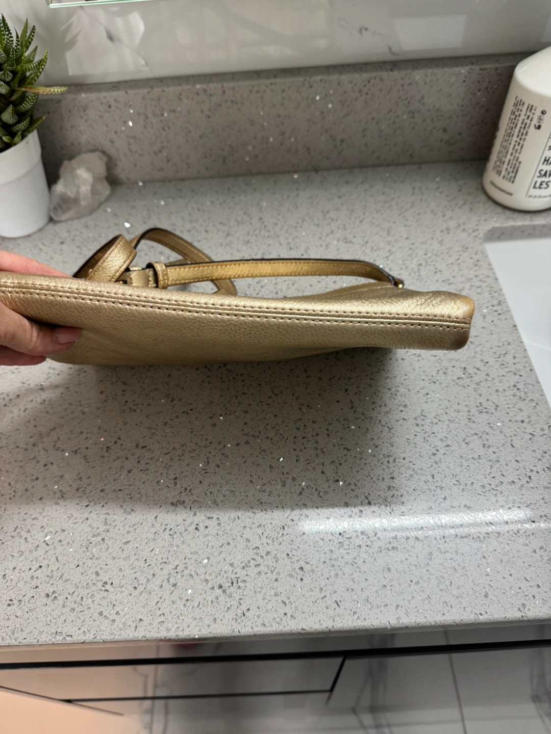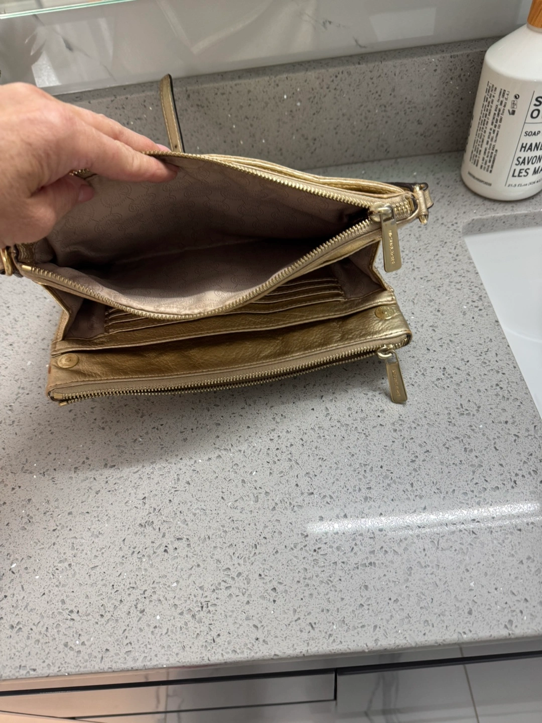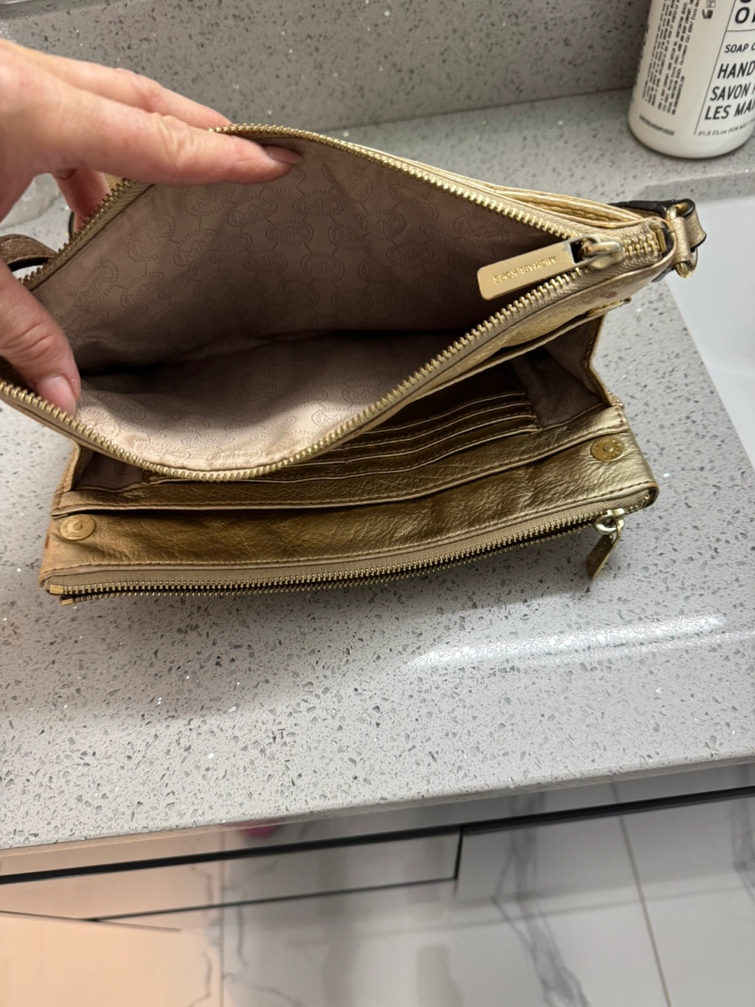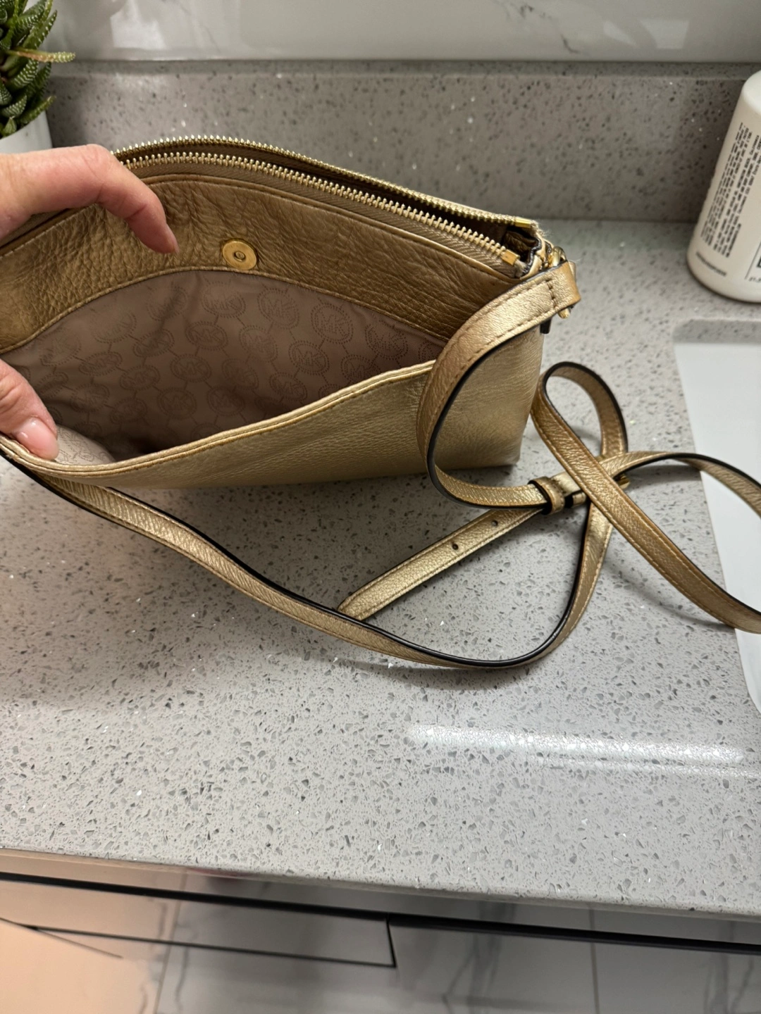 Gold crossbody bag. Features a zip closure and adjustable strap. Multiple interior pockets. Excellent for everyday use.