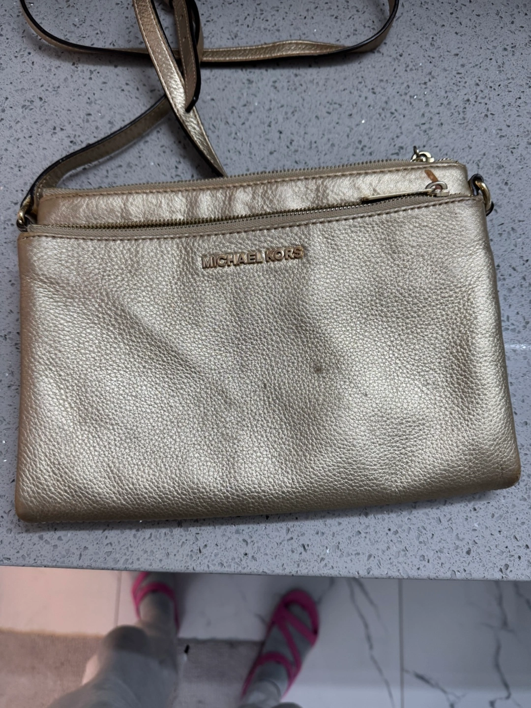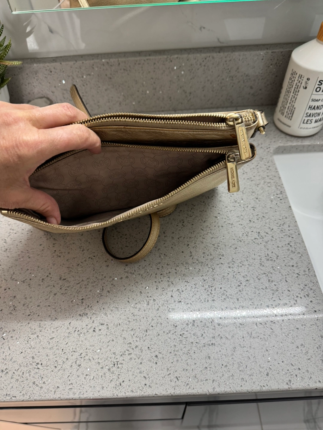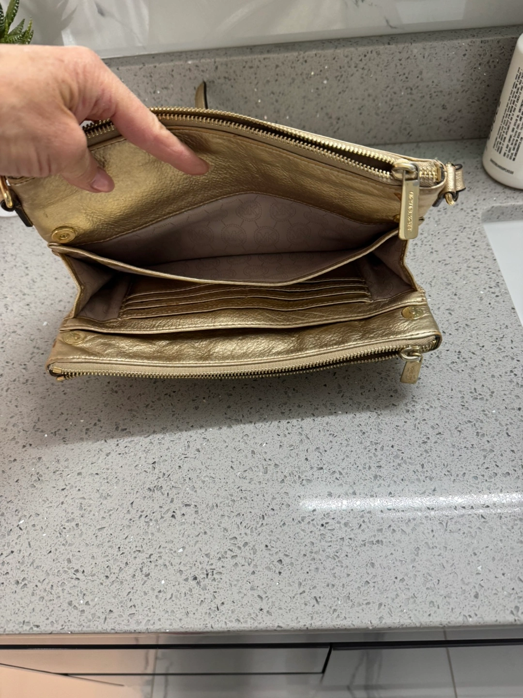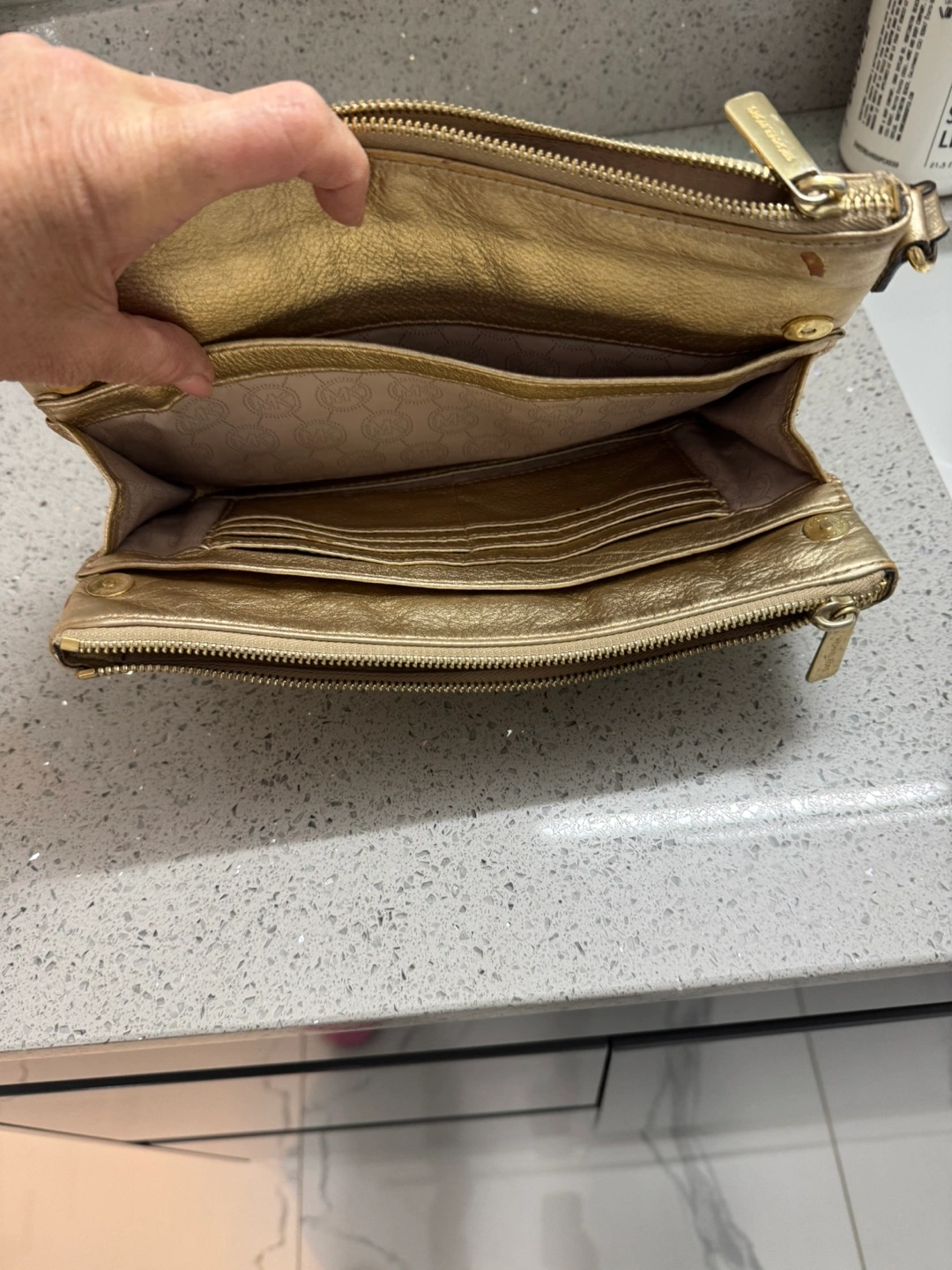 Gold crossbody bag. Features a zip closure and adjustable strap. Multiple interior pockets. Excellent for everyday use.
