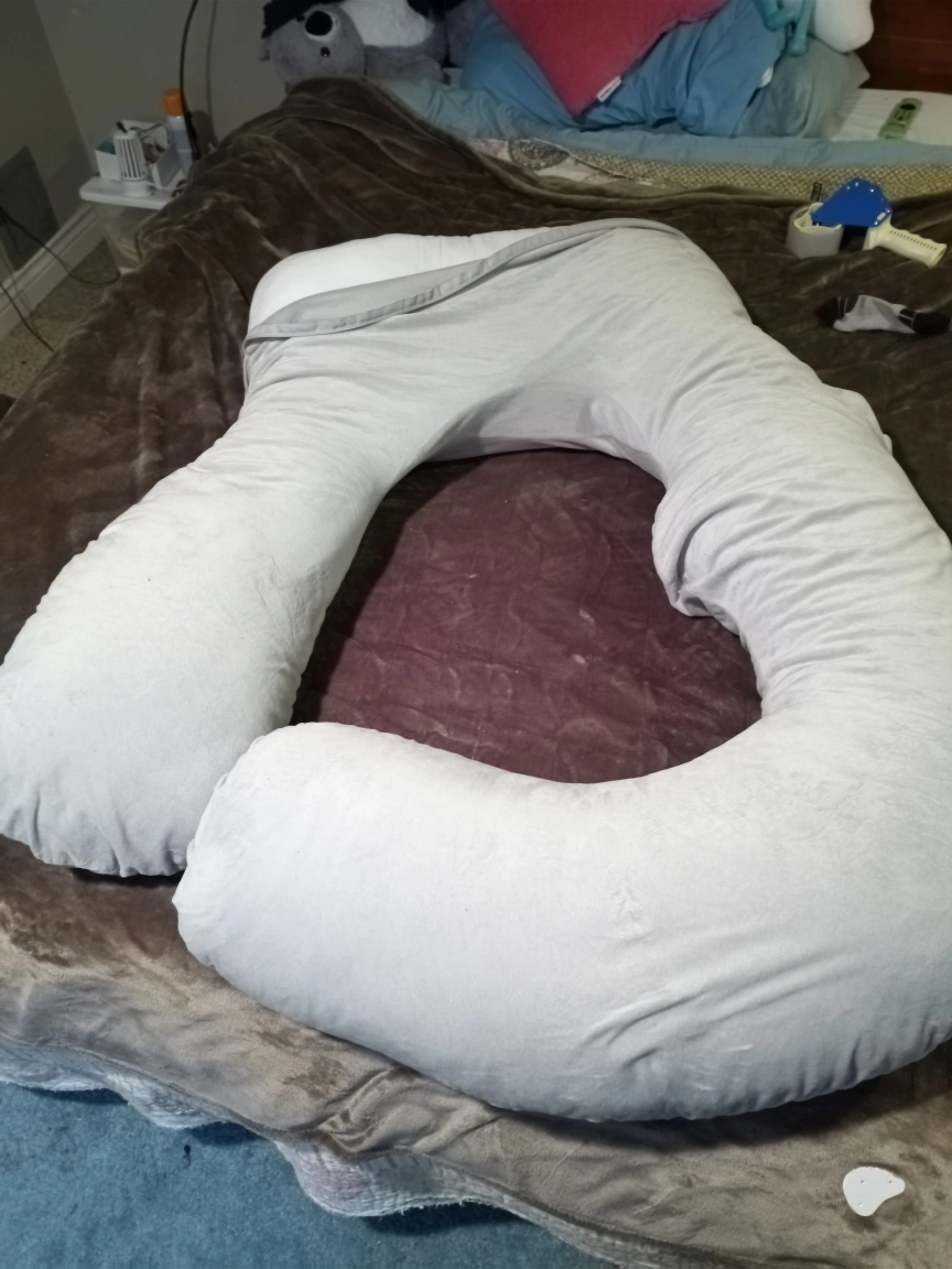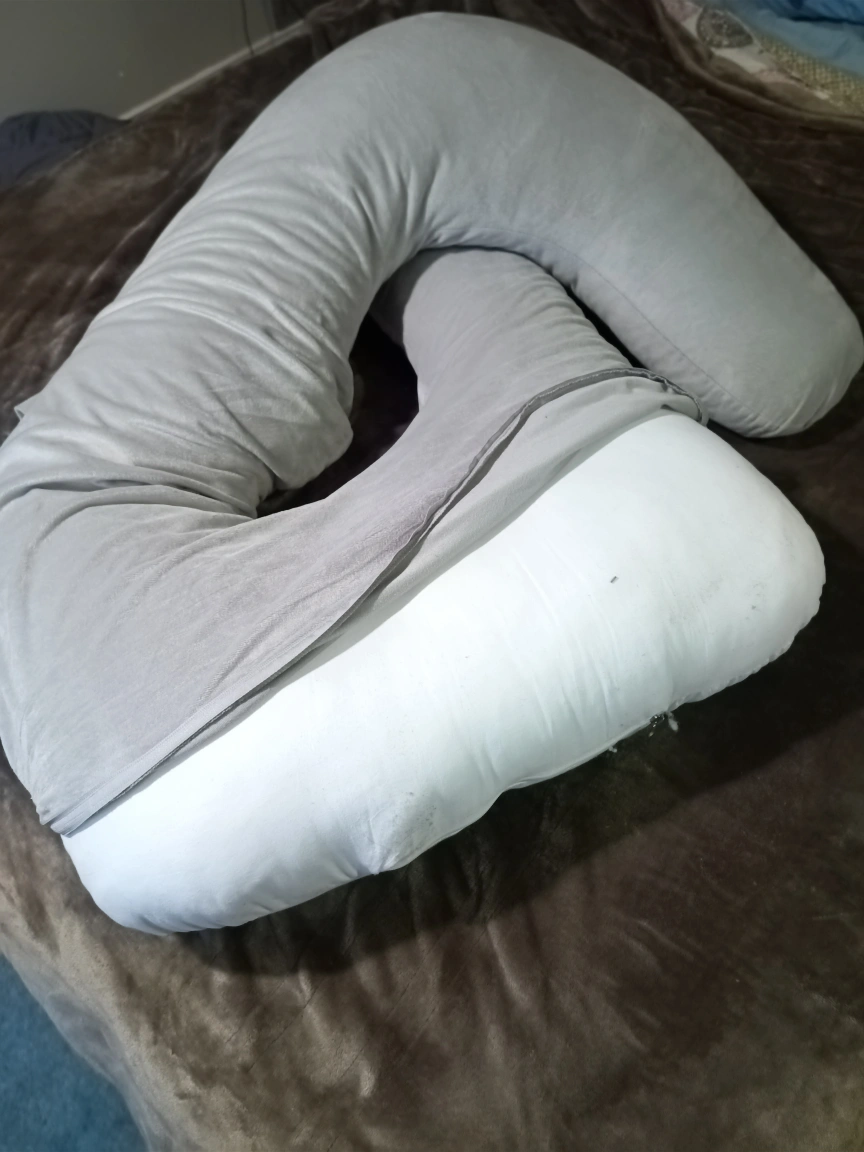 Large grey u-shaped pregnancy pillow. Soft, removable cover. Excellent support for sleeping during pregnancy. Used, but in good condition. Needs new zipper
