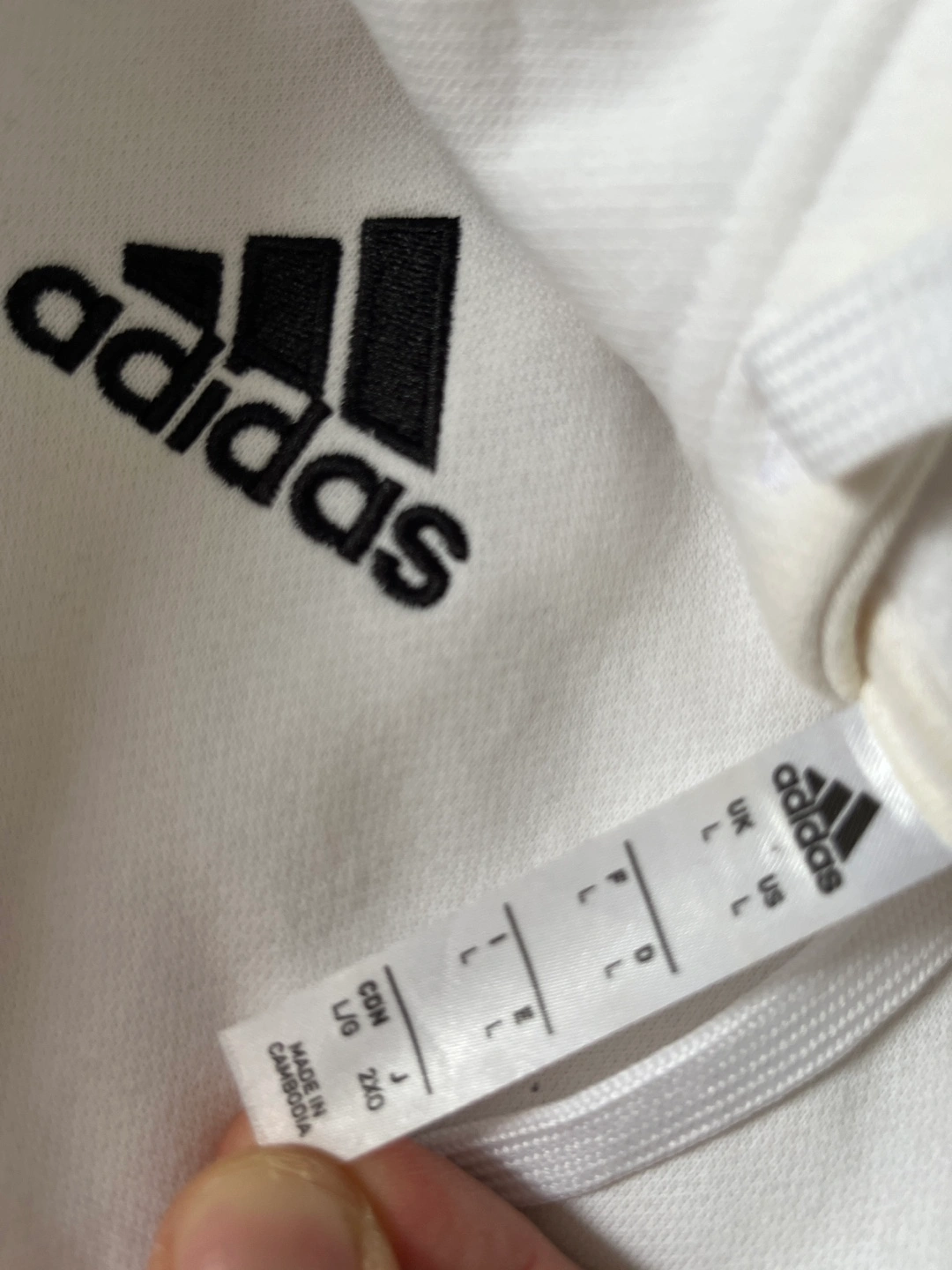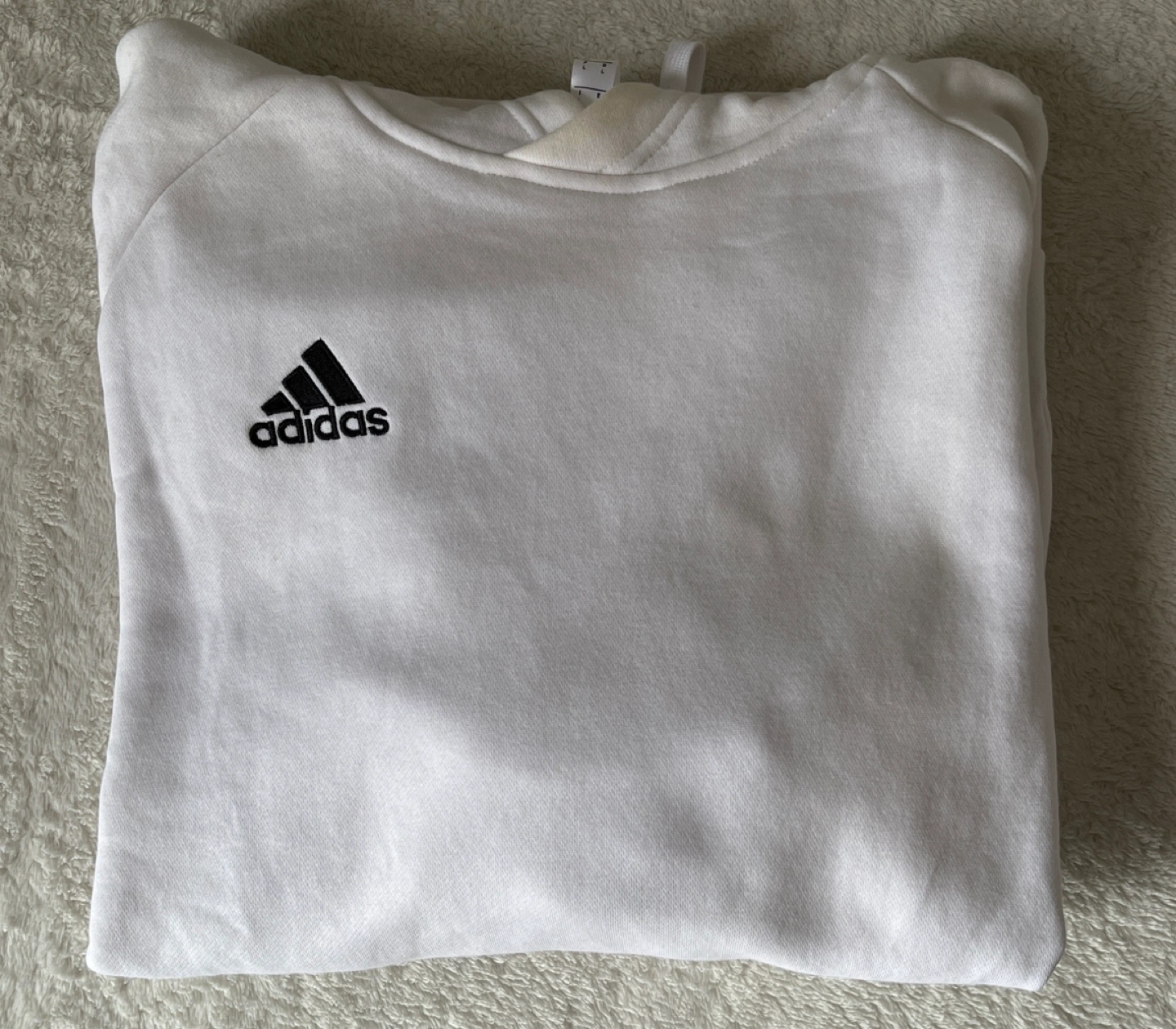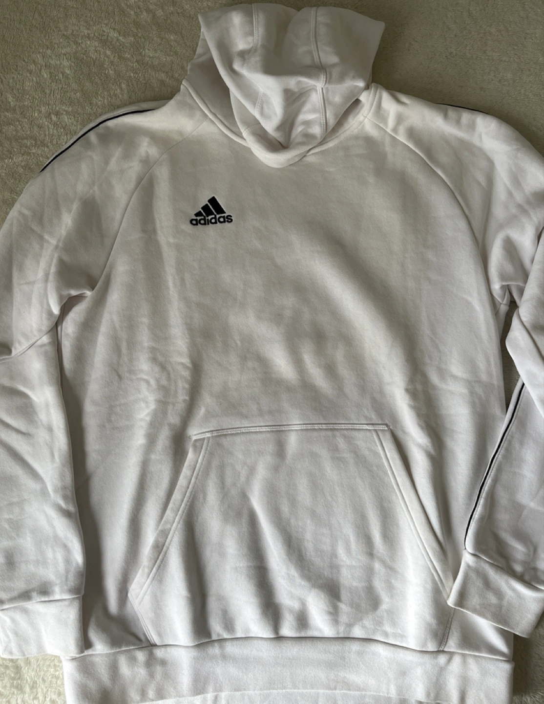 Men's Adidas hoodie. White colour. Size large. Features a kangaroo pocket and thin black stripes along the sleeves. Made in Cambodia.