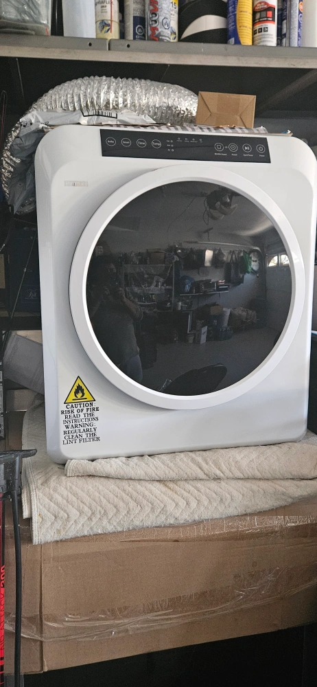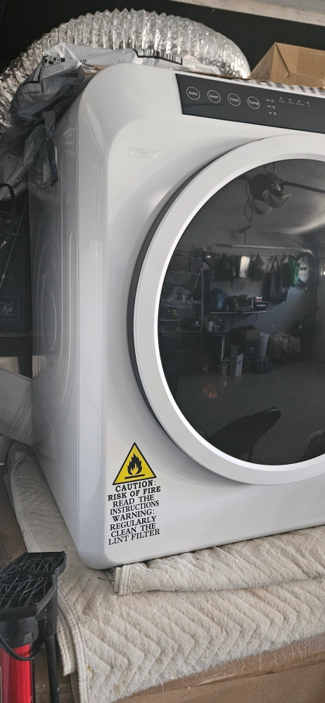 Compact dryer, easy to use. Features multiple settings. Includes vent hose. Clean the lint filter regularly to prevent fire.3.2 cu.ft 13 lbs