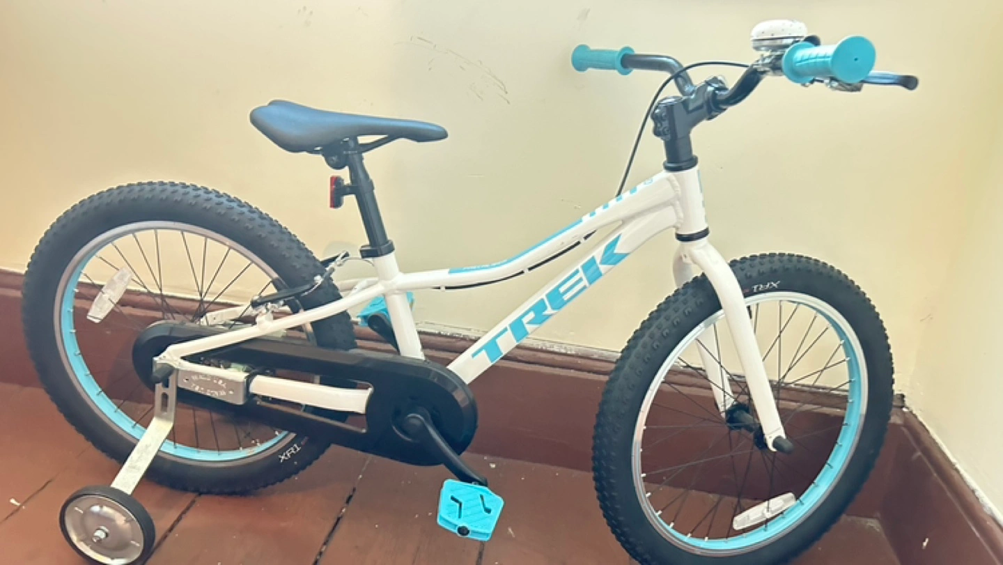 Girls' bike, white and light I blue accents. 16-inch wheels. Inclu/des training wheels. Great condition.