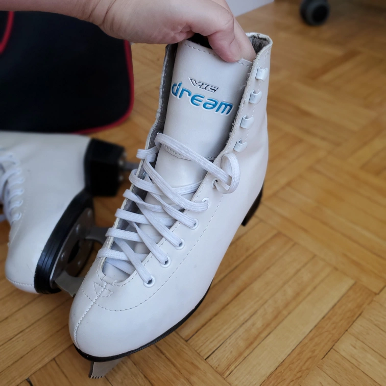 White figure skates. Includes a carrying bag. Lace-up design. Good for beginners or intermediate ice-skating. Female skate size US 5 or EU 36. Available for pick-up at Bayview Village