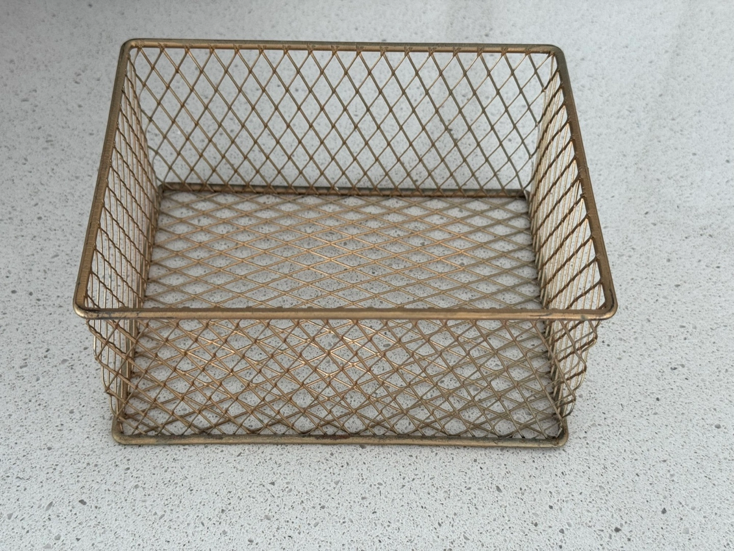 Small gold wire basket. Perfect for organizing small items. Lightweight and easy to clean.