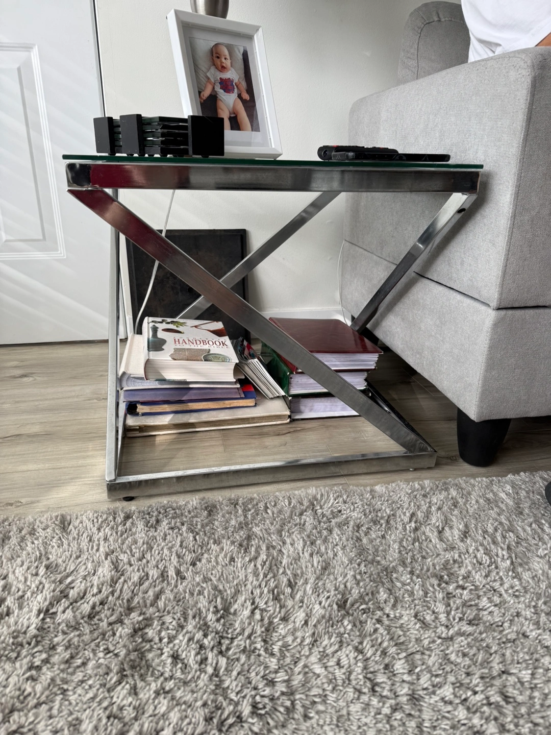 I bought it at WAYFAIR and got it at $2,500 Sleek 2 side and 1 center table glass top, chrome frame. X-shaped base. Great for modern living room. Great condition. Pick