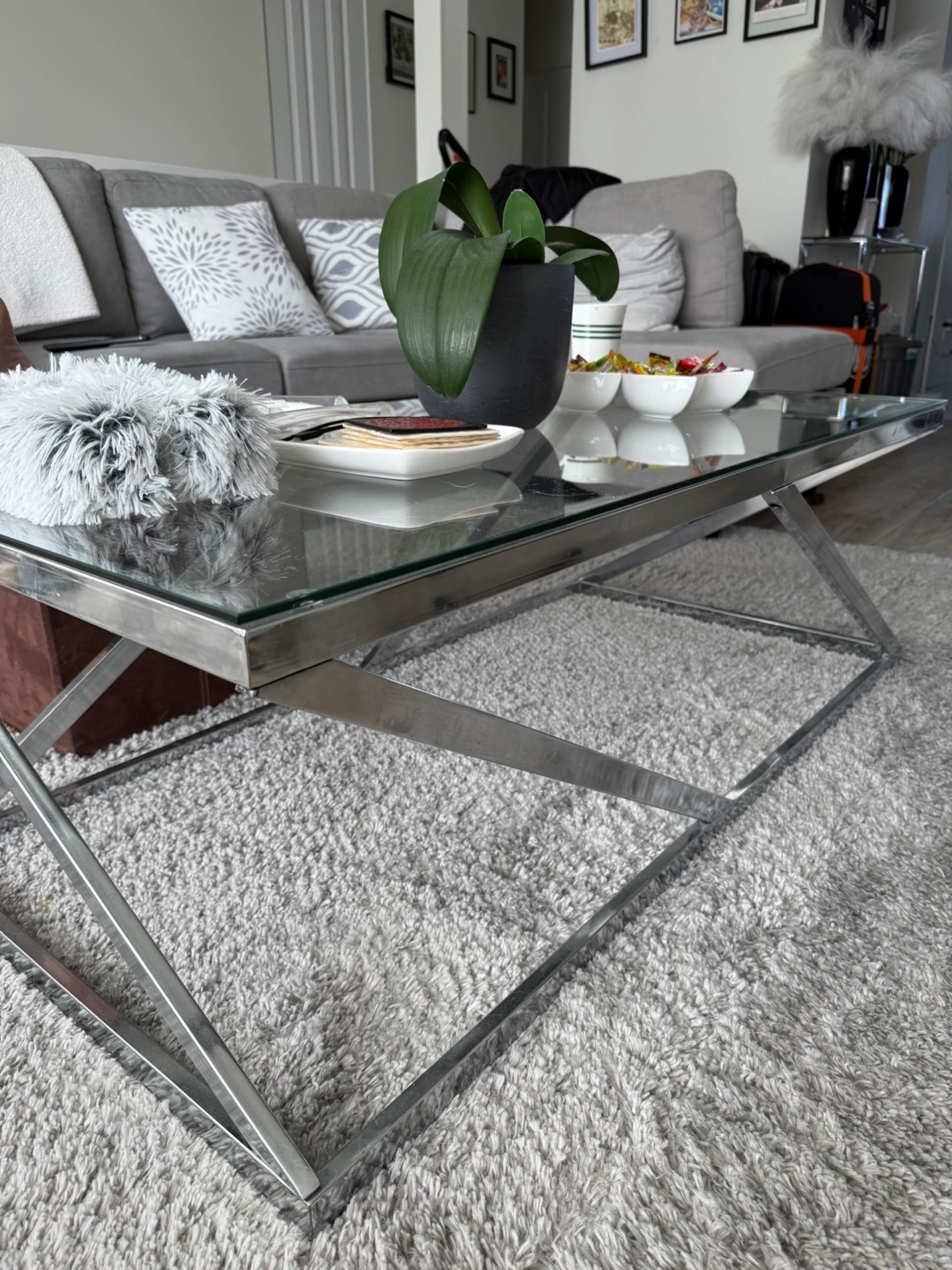 I bought it at WAYFAIR and got it at $850.00. Sleek center table glass top, chrome frame. X-shaped base. Great for modern living room. Great condition. Pick Up Serious inquiries. Price is firm.