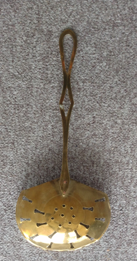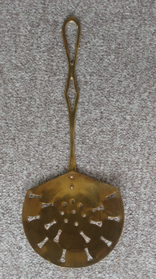 Antique brass fireside chestnut spoon. Minor usage marks on the side of the spoon. Spoon measures approximately 17 inches long with the spoon measuring 7 inches wide. Pickup in Mississauga or downtown Toronto (Union Station).