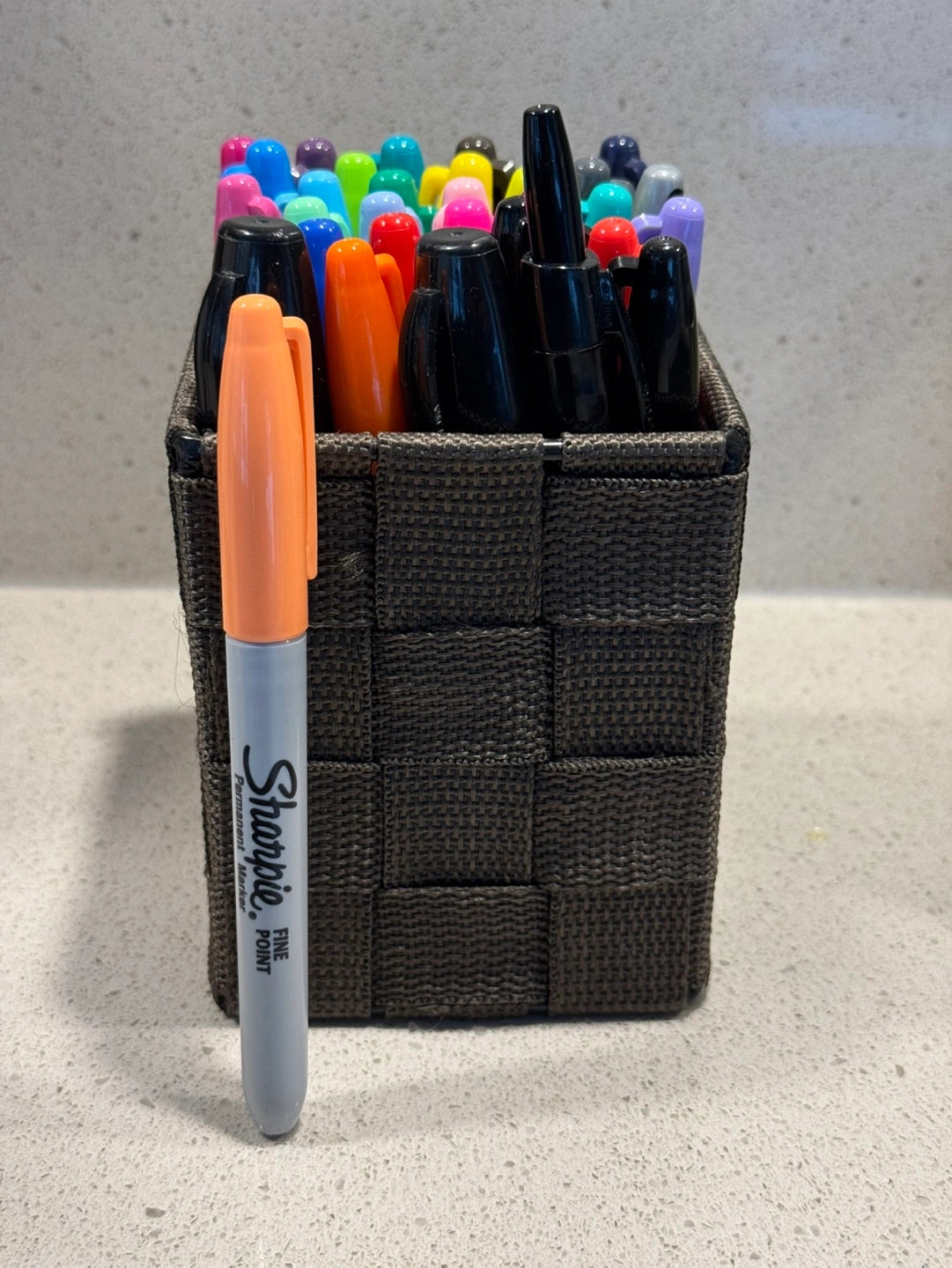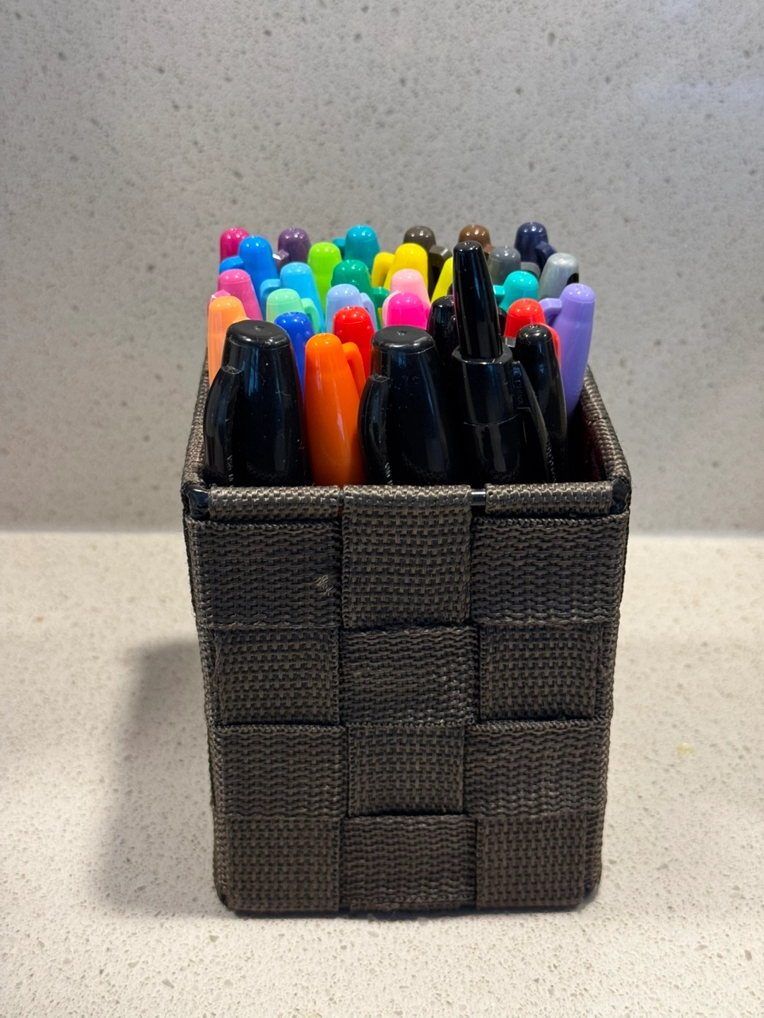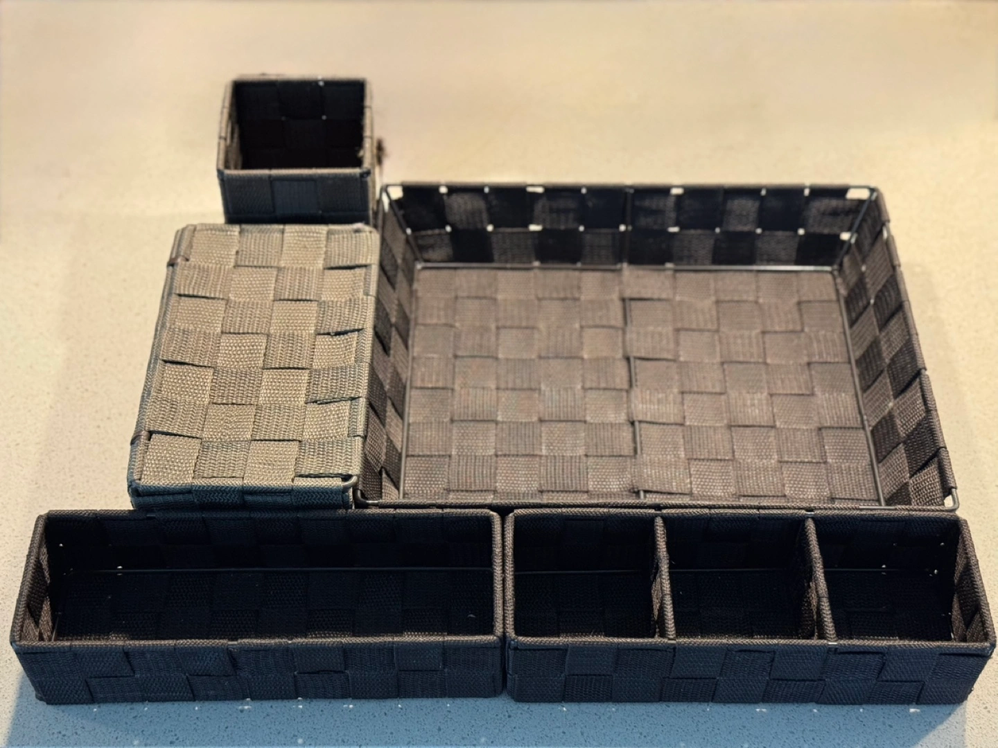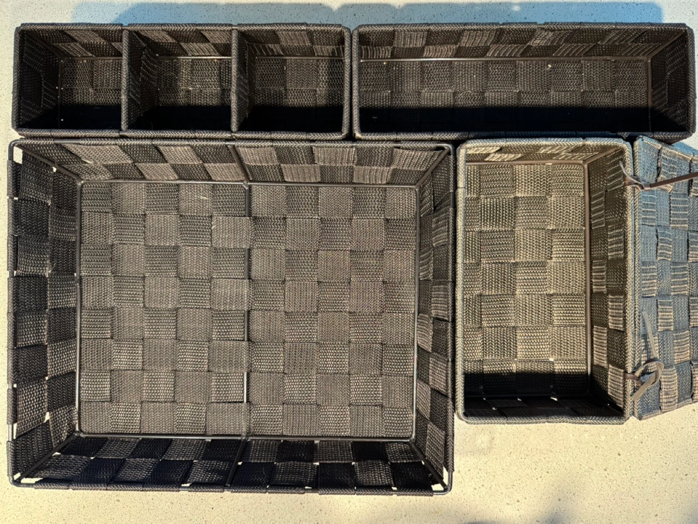 6 woven storage baskets. Various sizes. One is Lidded. Ideal for organizing closets, shelves, or drawers.