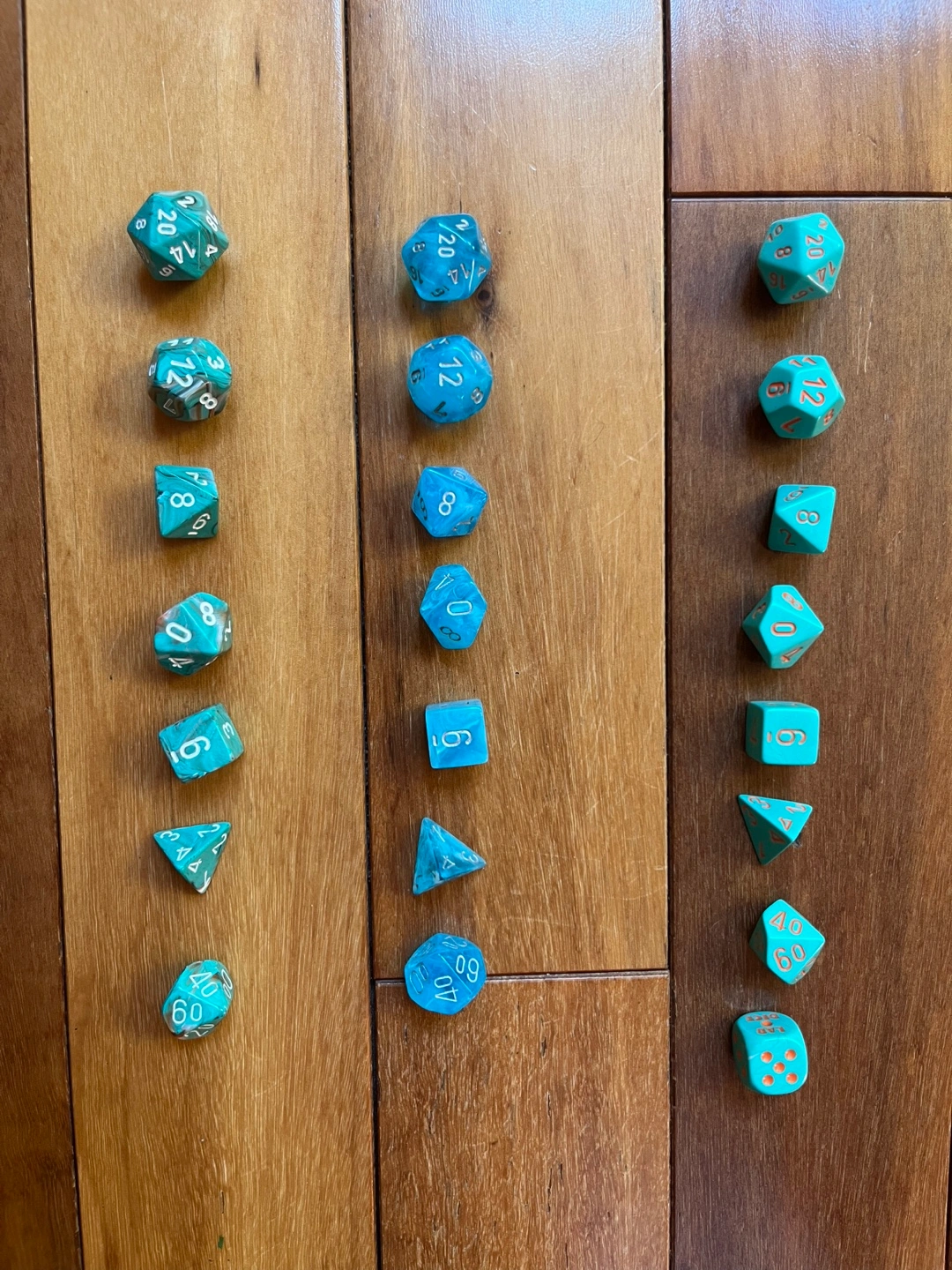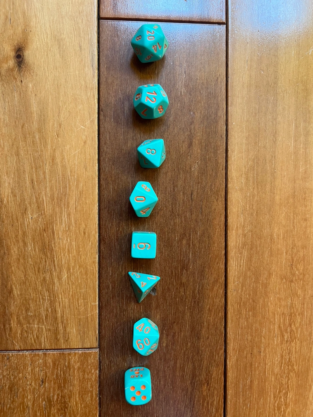 Seven-piece polyhedral dice set. Complete 7 set, the reel and orange has a bonus 6 sided dice. Great for tabletop gaming.