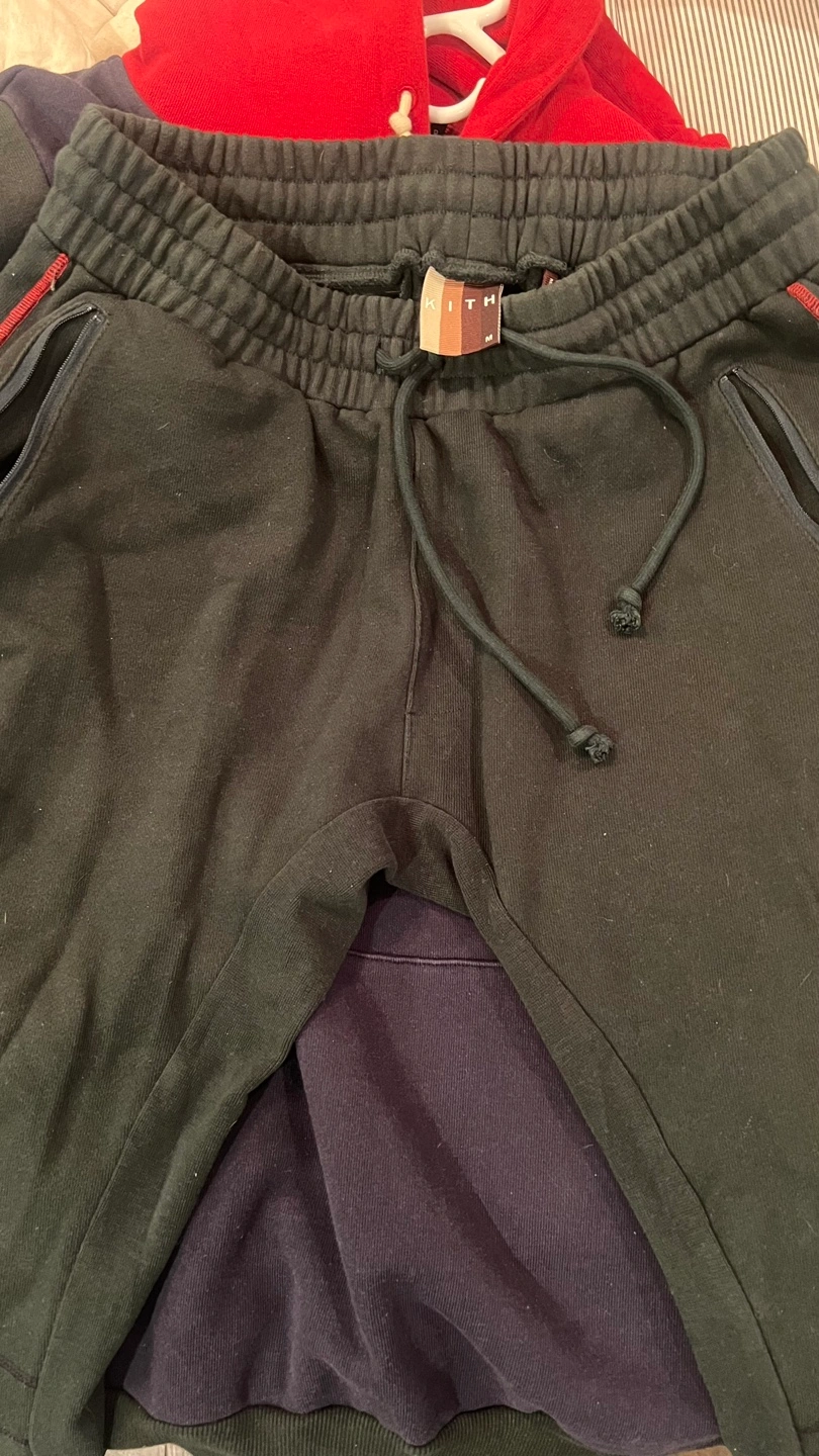 Men's KITH color block hoodie and sweatpants. Hoodie features a multi-colored design. Sweatpants dark green with red accents. Size not specified.
