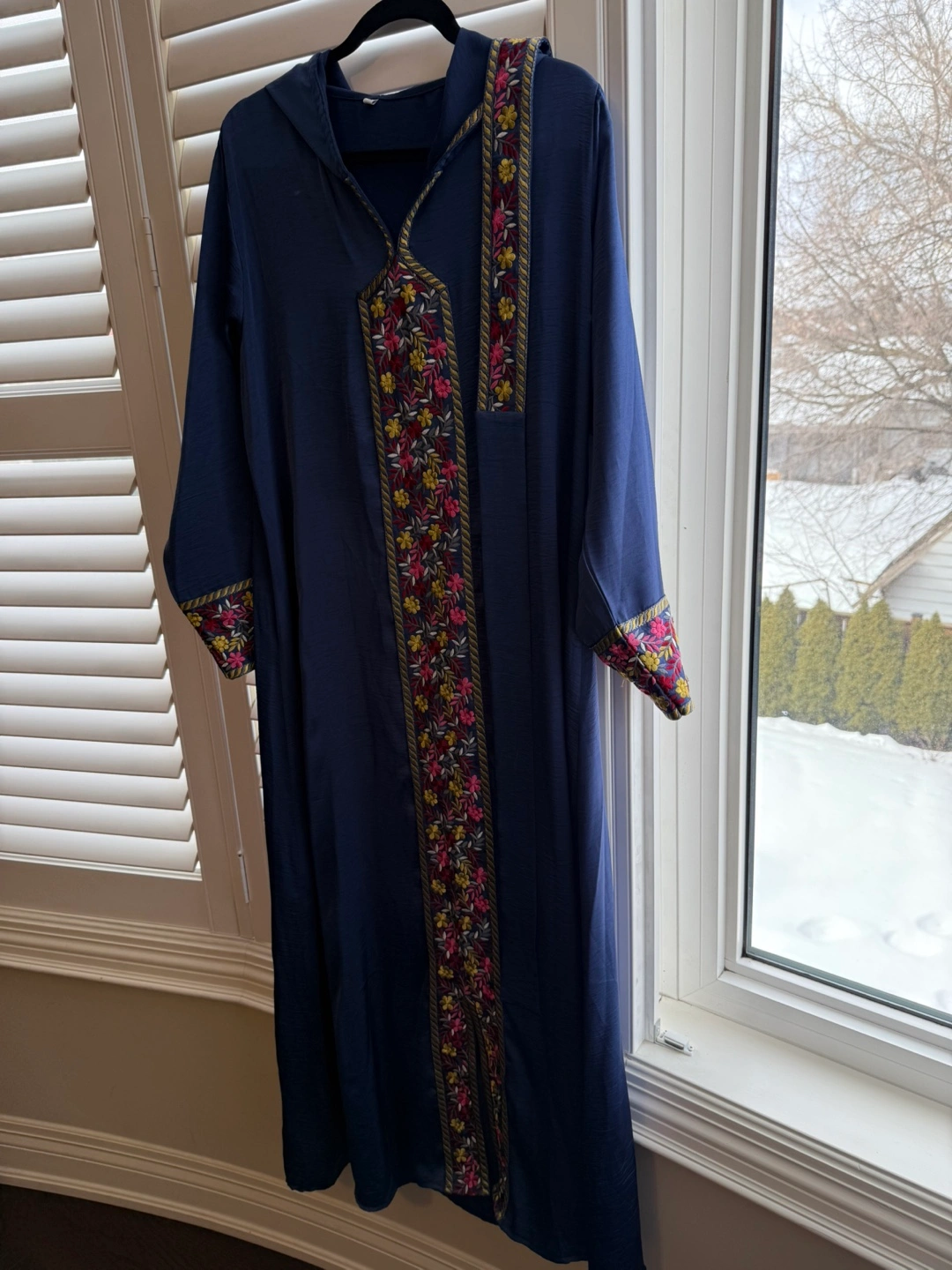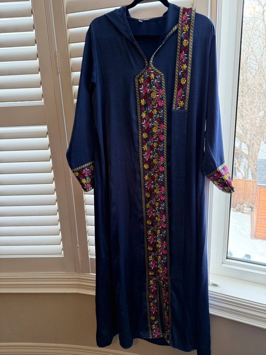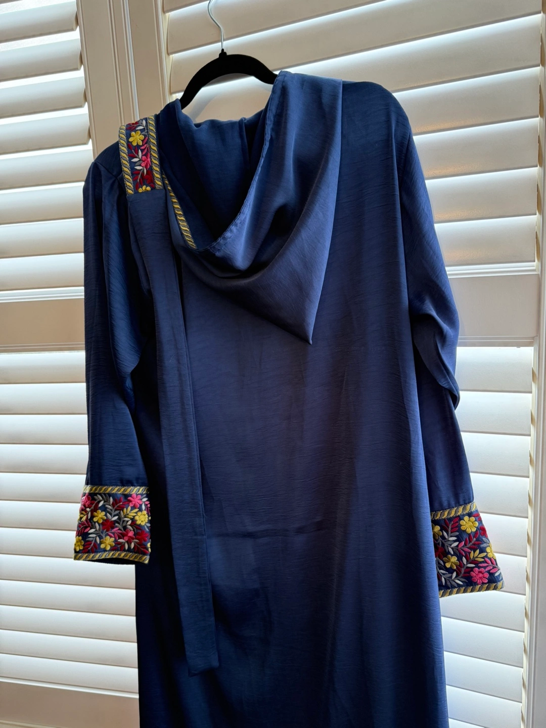 Beautiful navy blue kaftan. Features a hood, long sleeves, and colourful embroidered details. Long length, relaxed fit. Perfect for layering or wearing alone. Also come with embroidered belt.