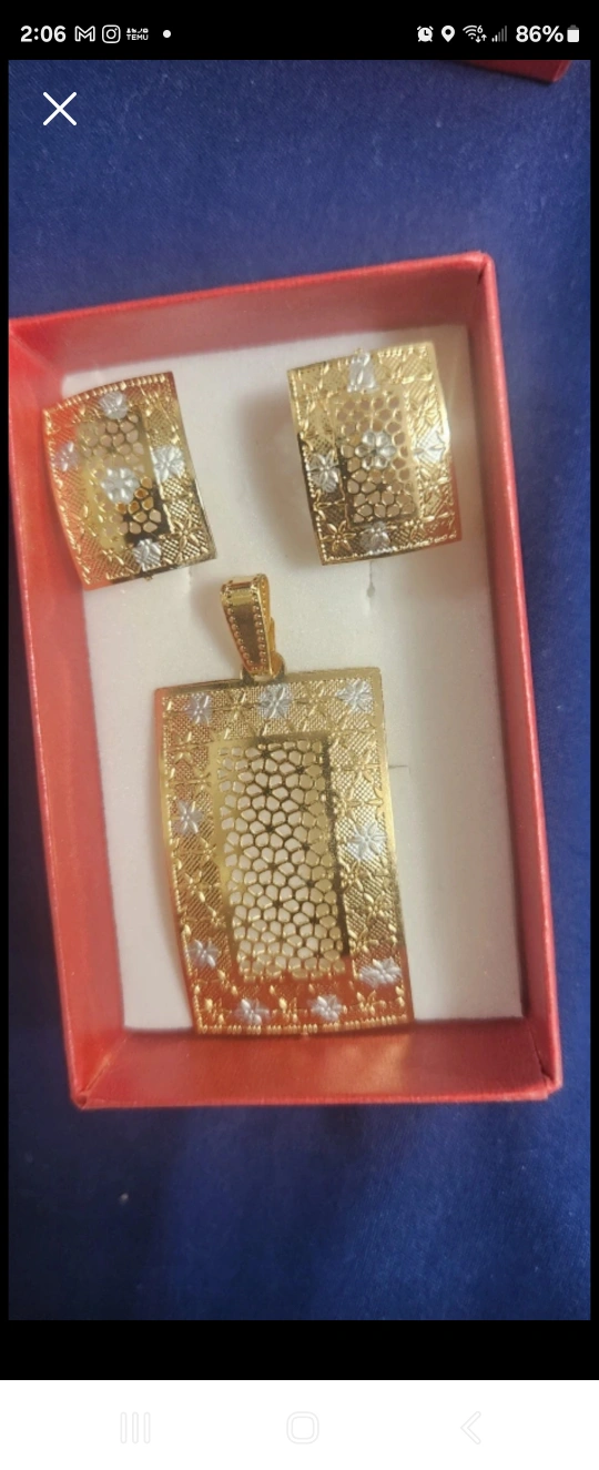 Beautiful gold tone pendant and earrings set. Rectangular design. Intricate cut-out detailing. Comes in a red box.