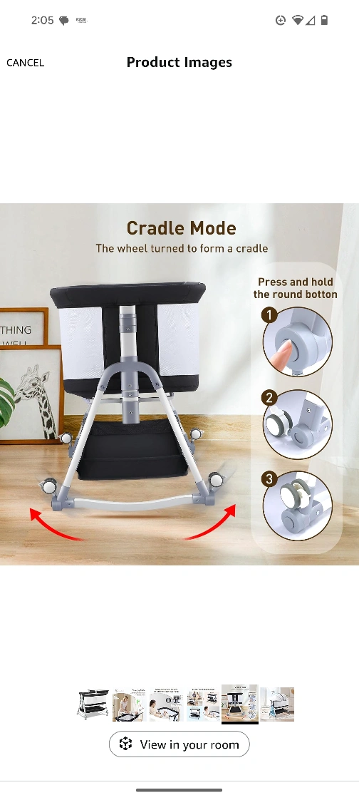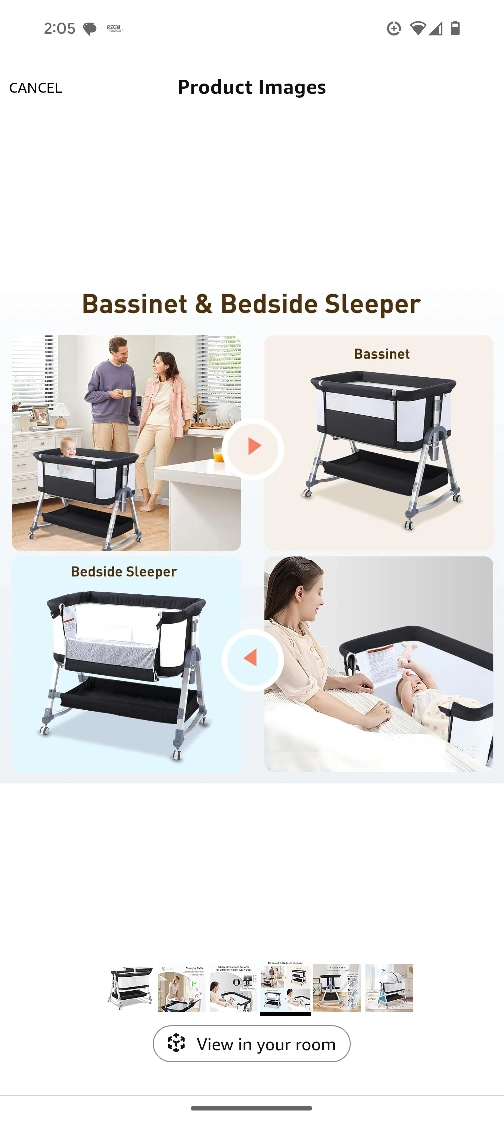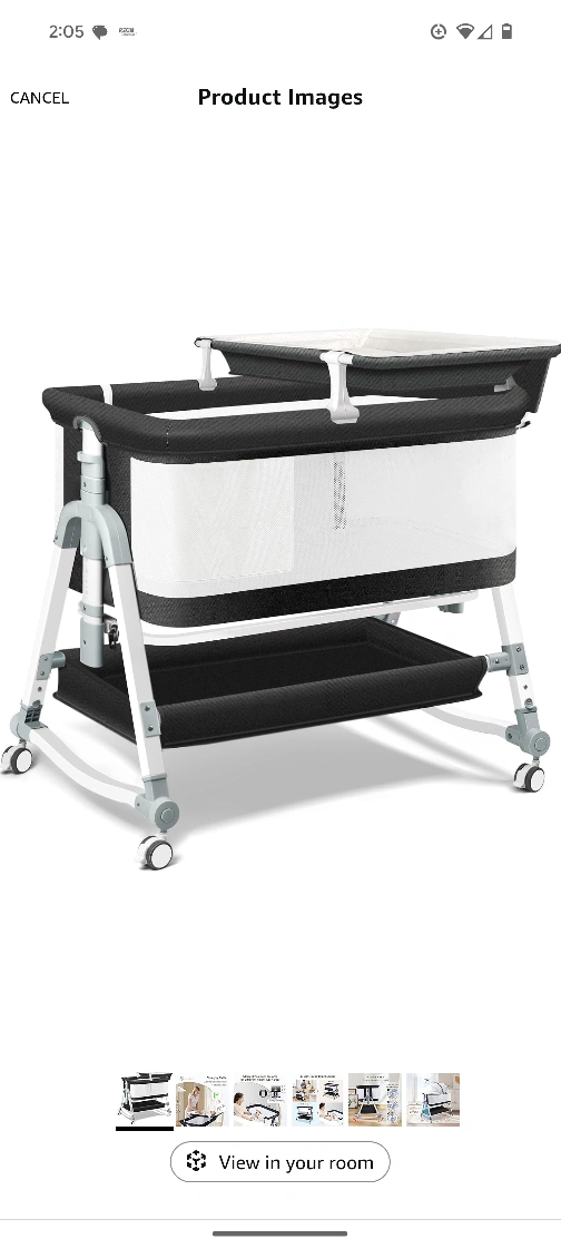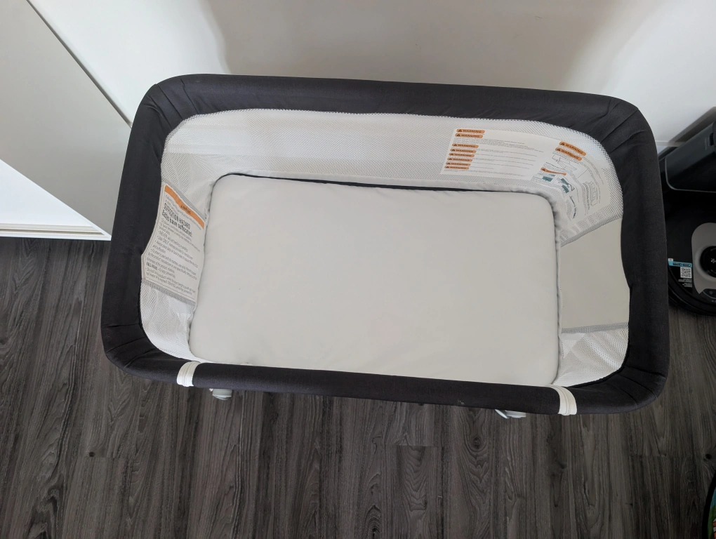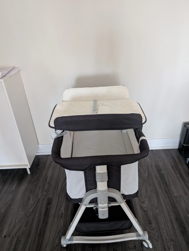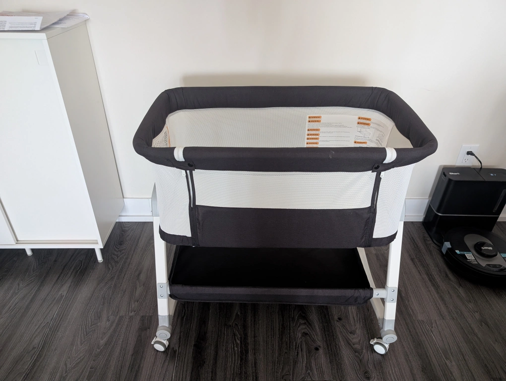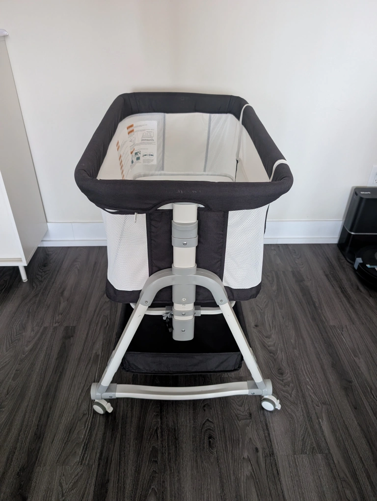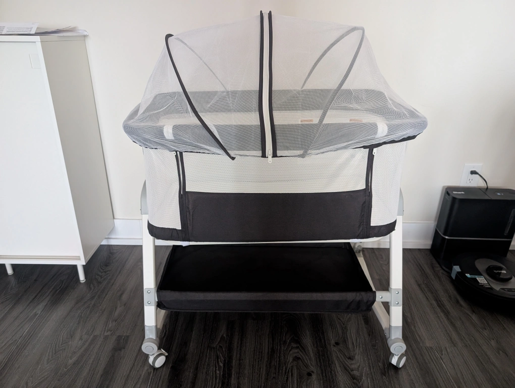 Portable bassinet with stand, storage shelf, and mosquito net. Easy to assemble and move around. Great for co-sleeping or travel. Includes mattress.
