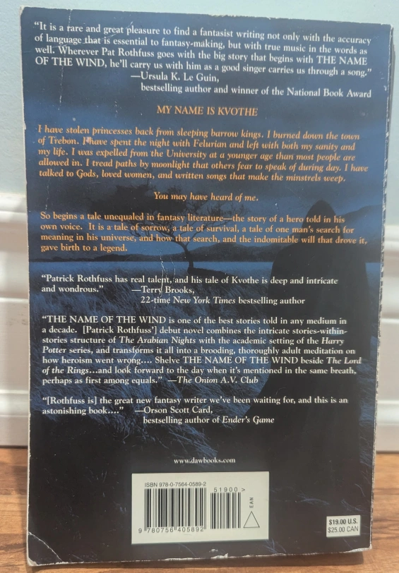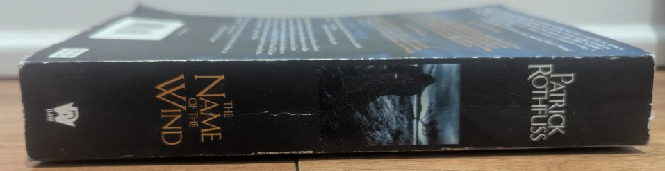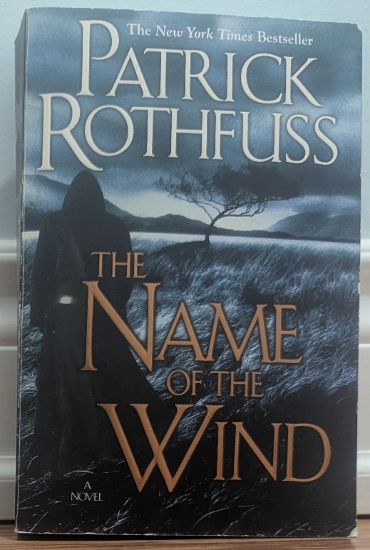 Paperback copy of The Name of the Wind. New York Times bestseller. A novel by Patrick Rothfuss. Shows some wear.