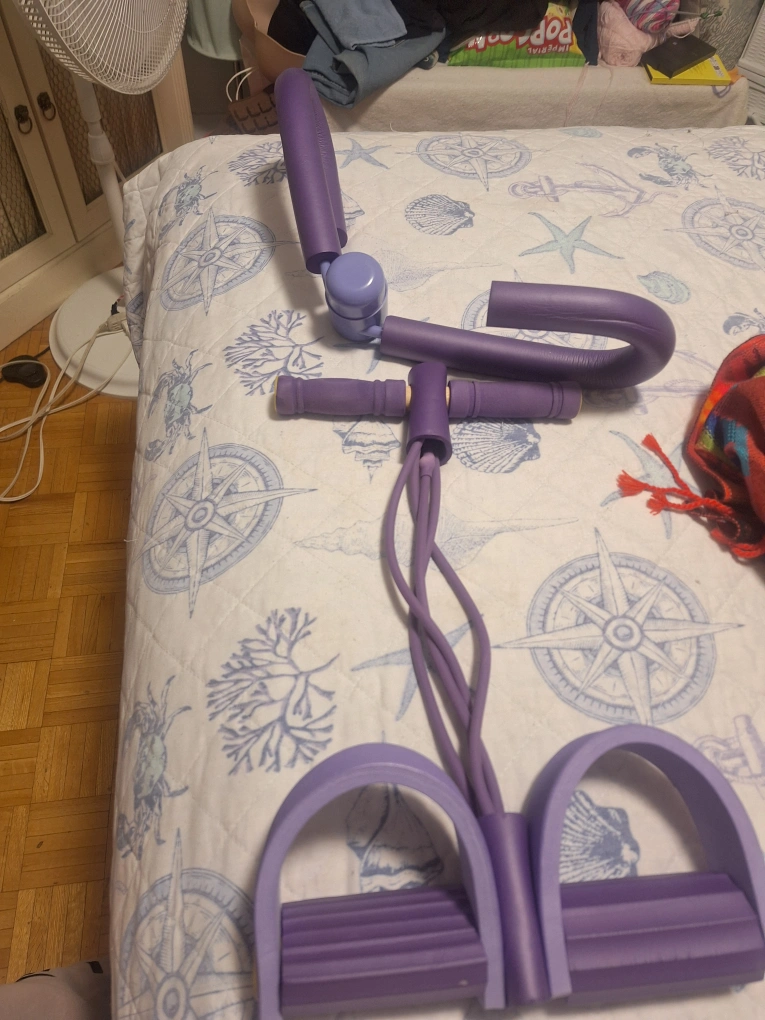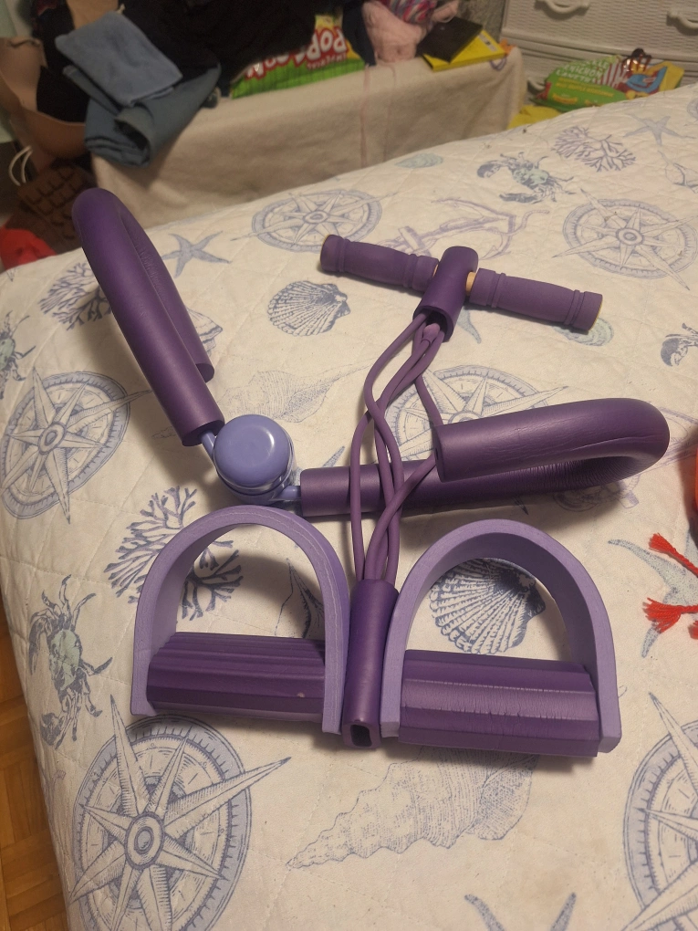 Portable toning exerciser. Great for strengthening arms and legs. Lightweight and easy to use. Purple plastic construction. Includes resistance bands.