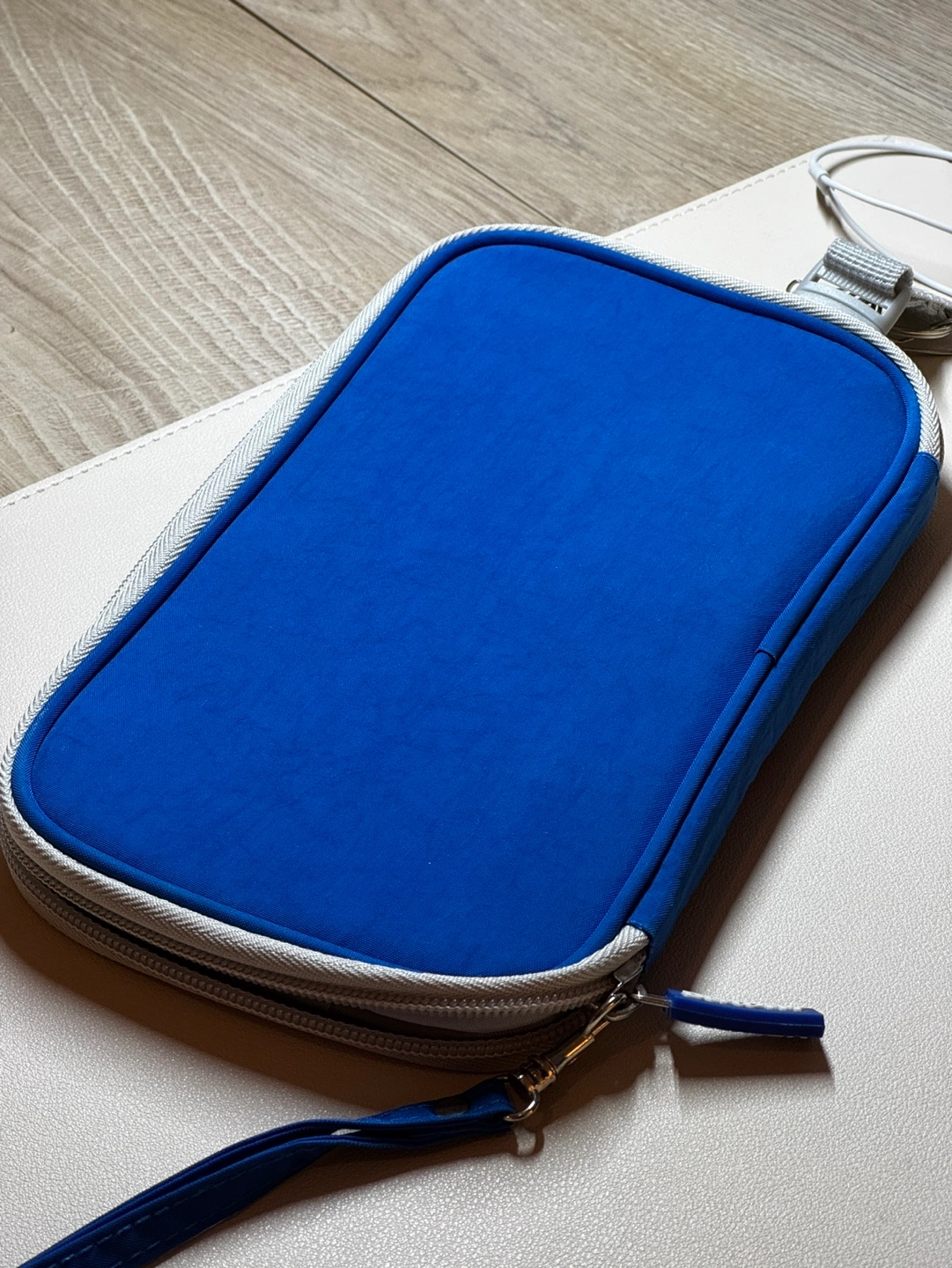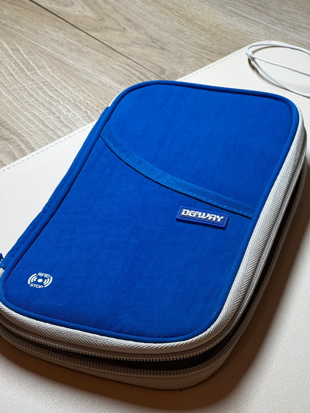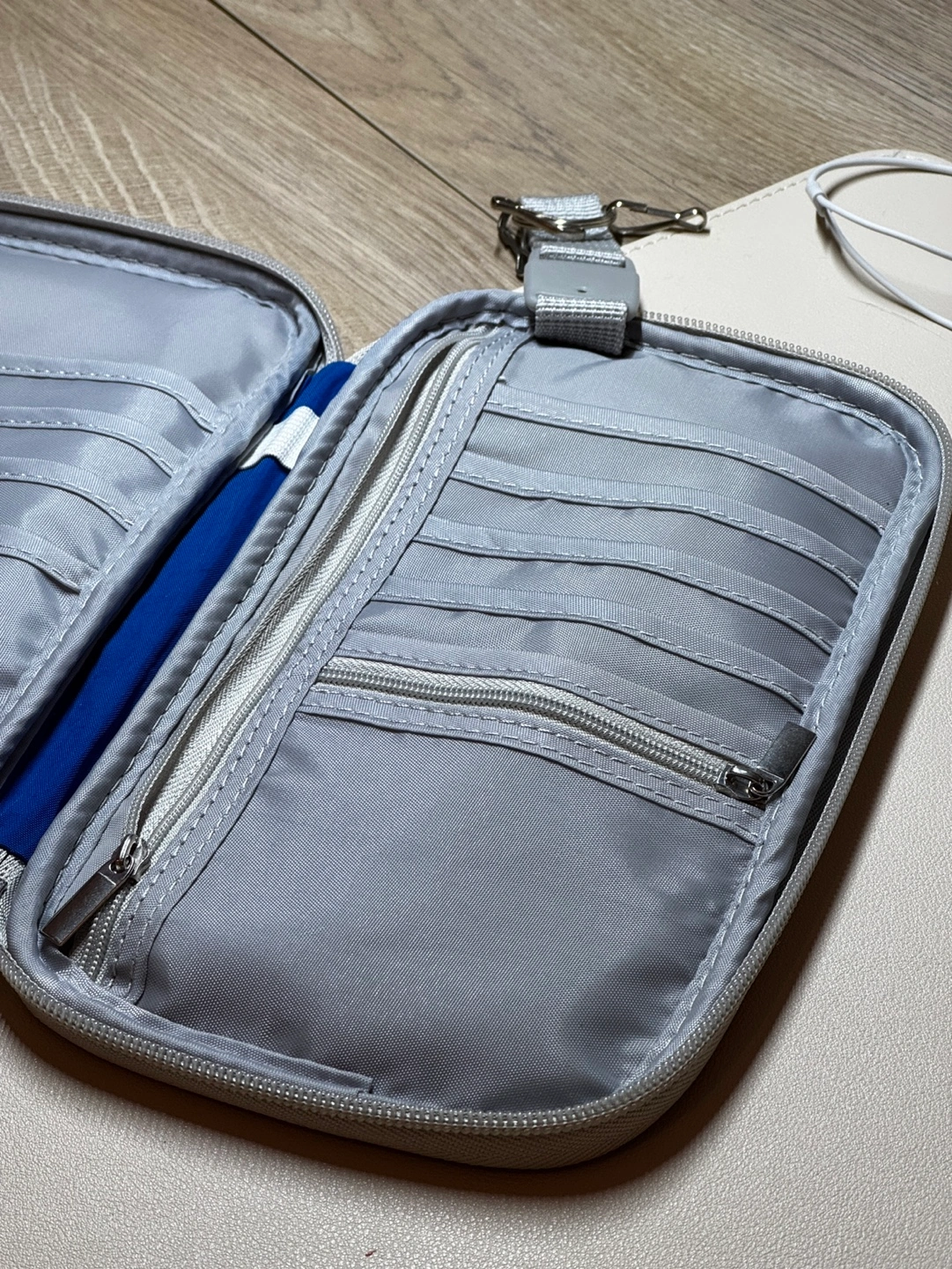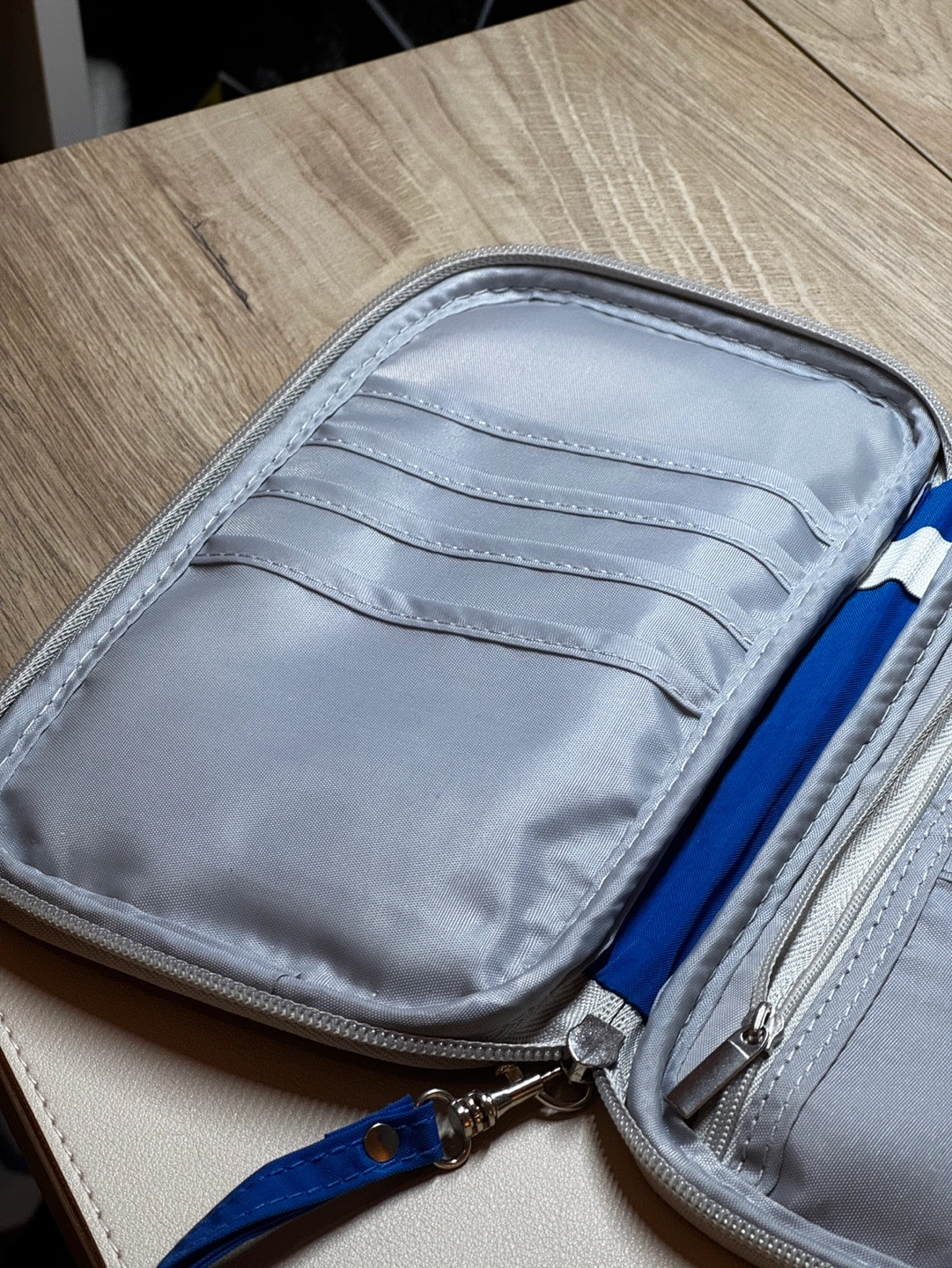 65Portable travel wallet. Multiple card slots and zippered compartments. Grey interior, blue exterior. Includes wrist strap.
