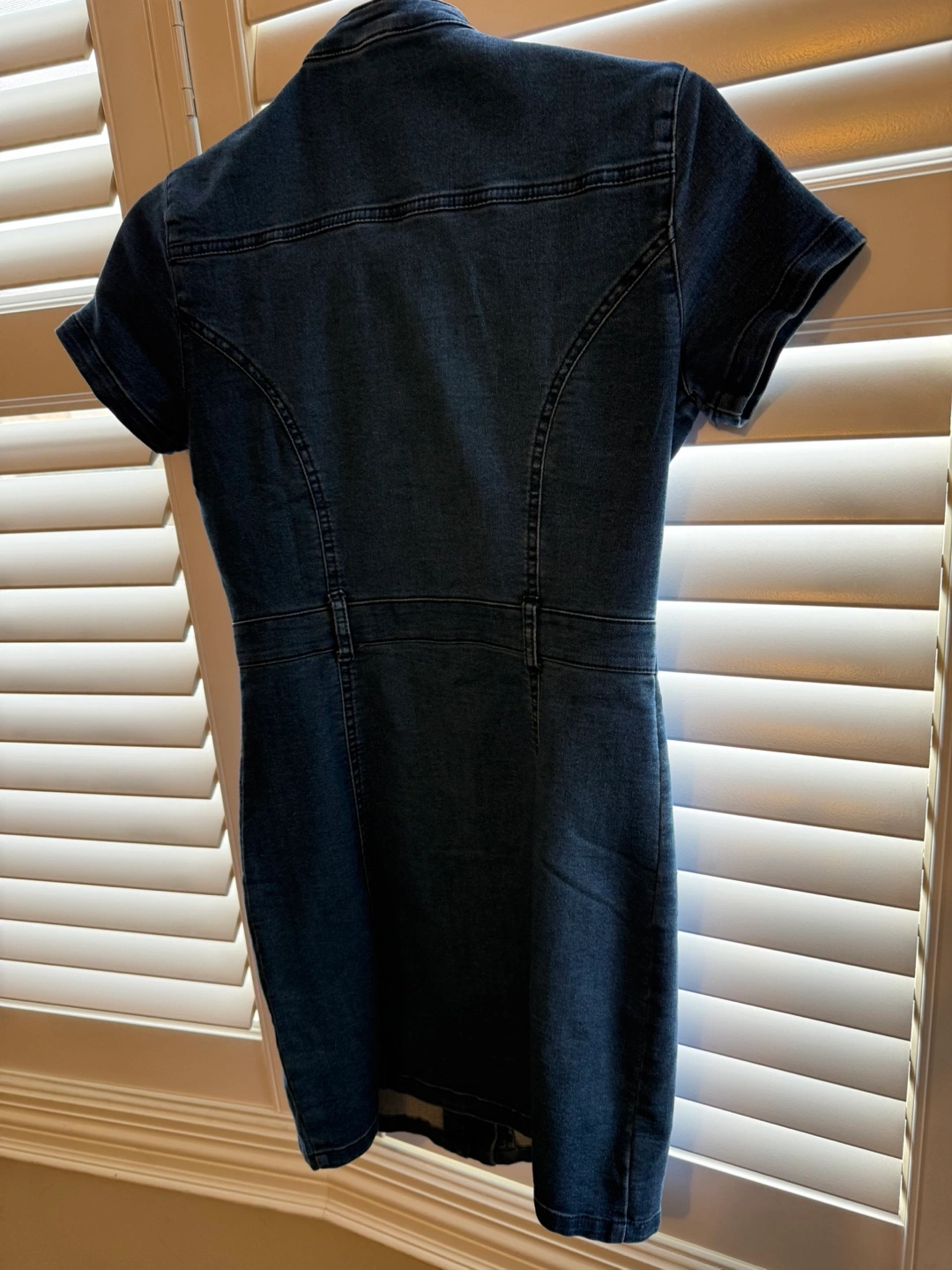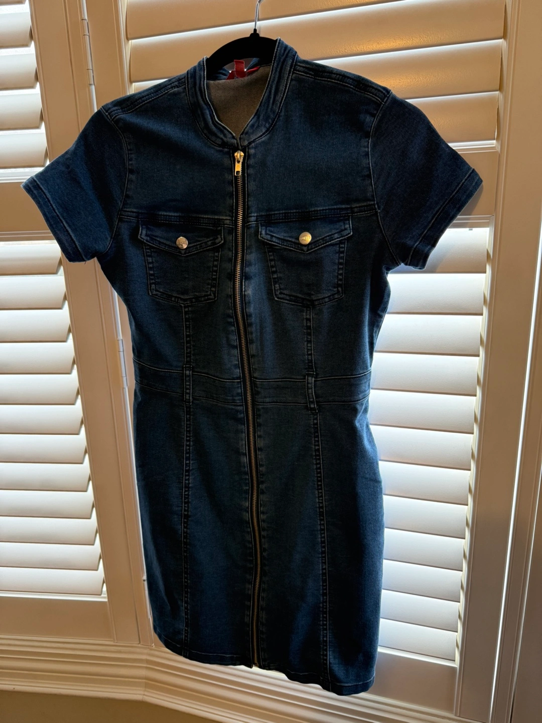 Cute, form-fitting denim mini dress. Features a full-length zipper and short sleeves. Two front pockets. Perfect for a night out or casual daytime wear.