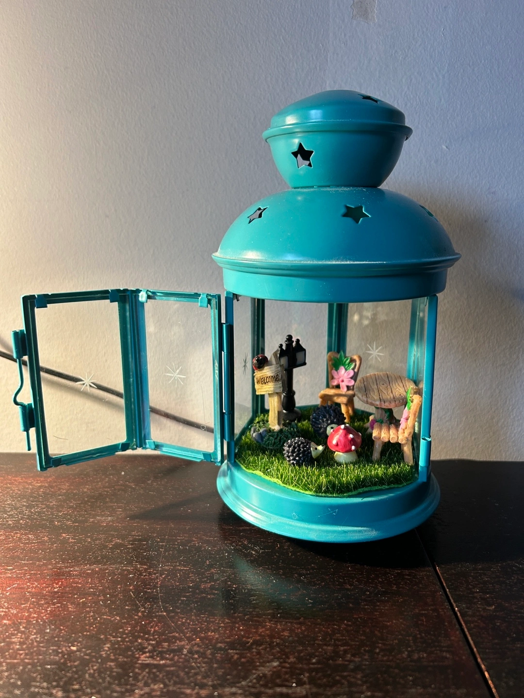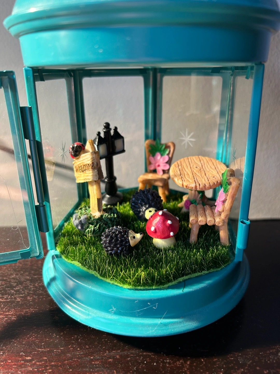 Teal metal lantern. Glass sides. Miniature fairy garden inside. Features tiny table, chairs, hedgehogs, mushrooms, and a welcome sign. Perfect whimsical decor. LED light embedded within the lantern to light up, battery included.