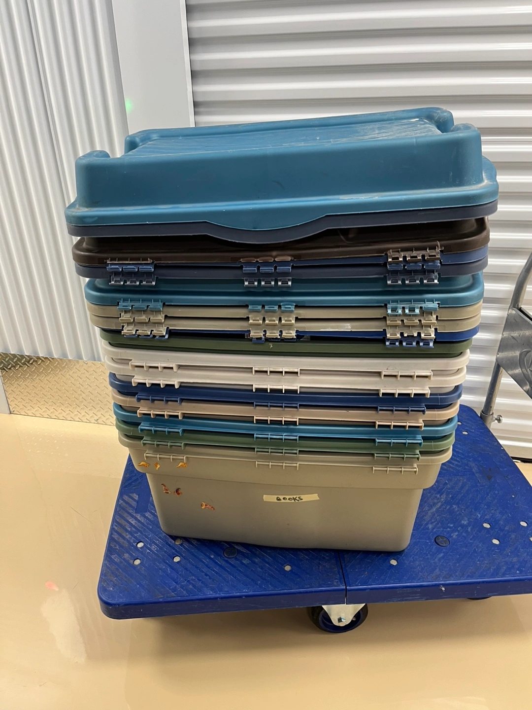 Multiple plastic storage bins, various colours. Good for organizing and storing items. Sold as a lot.