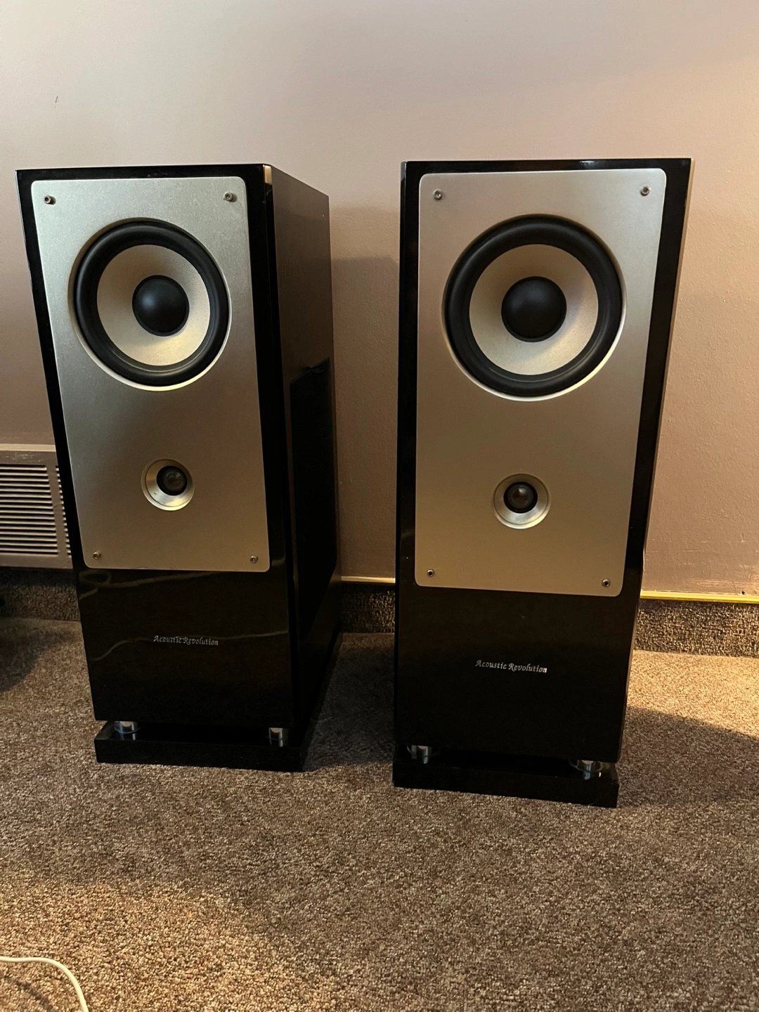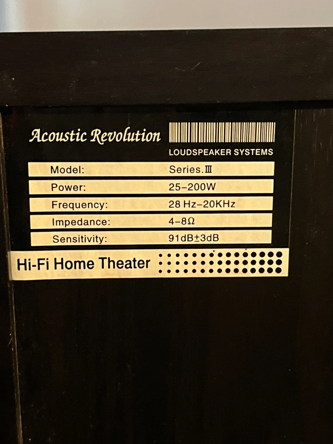 Pair of Acoustic Revolution Series II loudspeakers. Model 25-200W. 28 Hz-20kHz frequency response. 4-8Ω impedance. 91dB sensitivity. Excellent home theatre speakers.