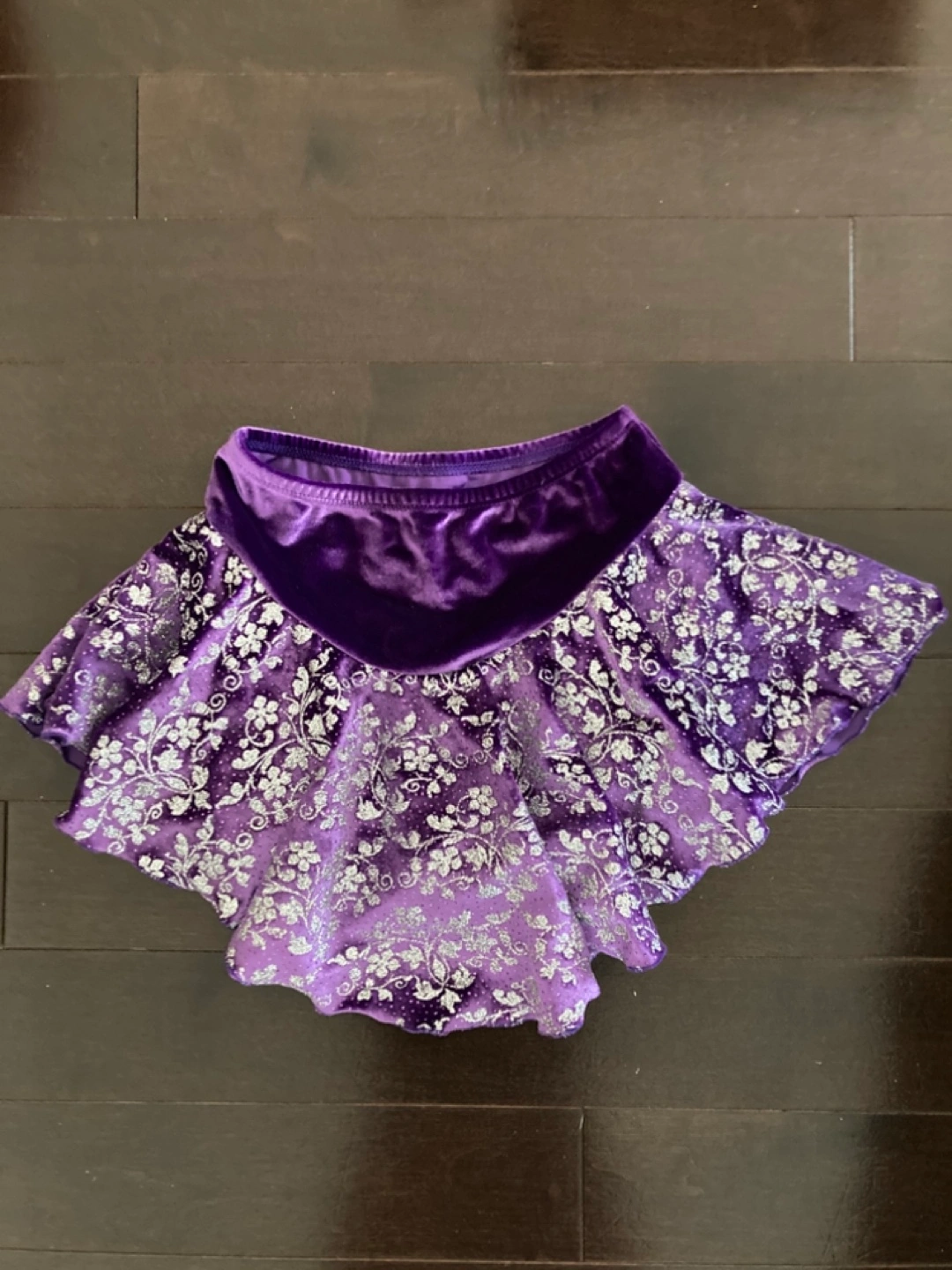 Gorgeous purple velvet figure skating skirt. Features a fitted velvet waistband and a flared skirt with a silver floral pattern. Great for figure skating or ice dancing.