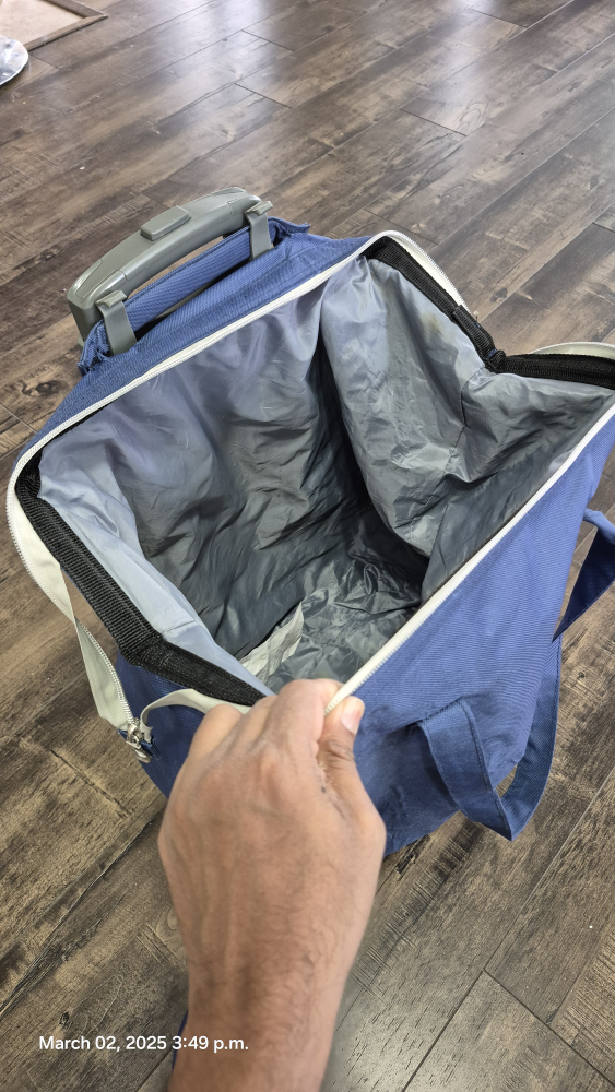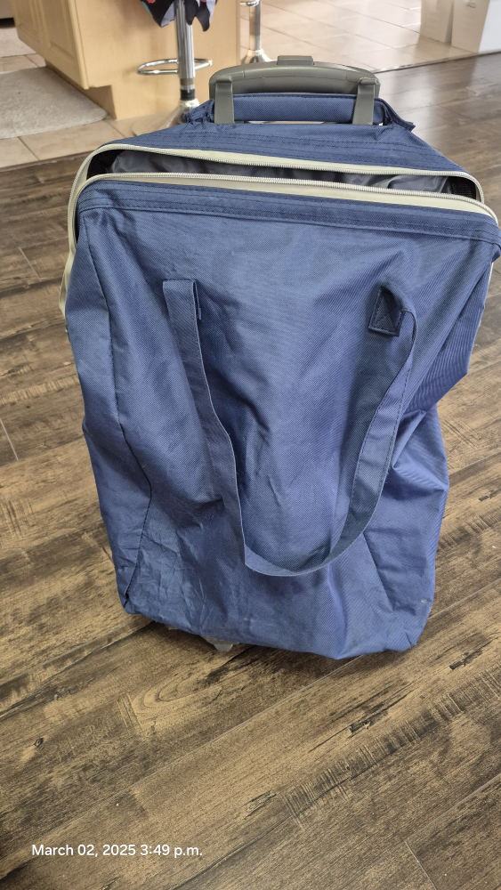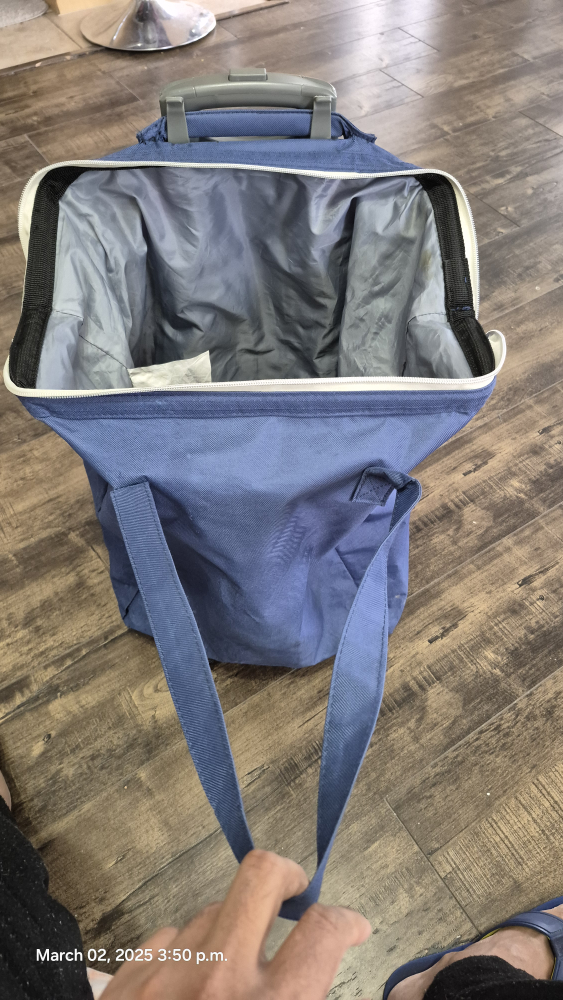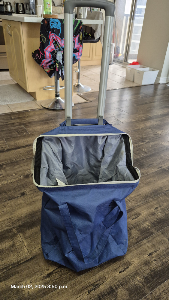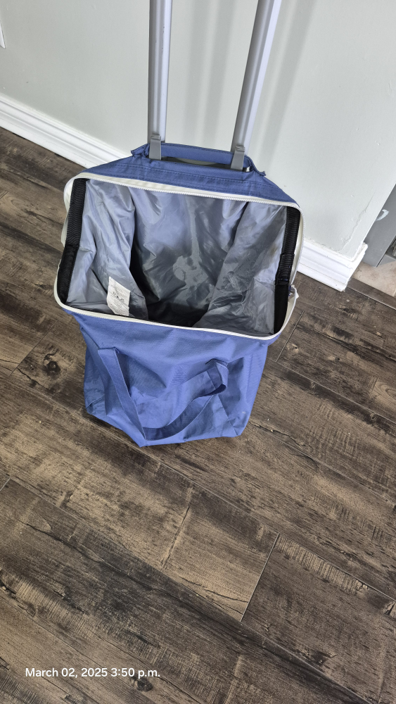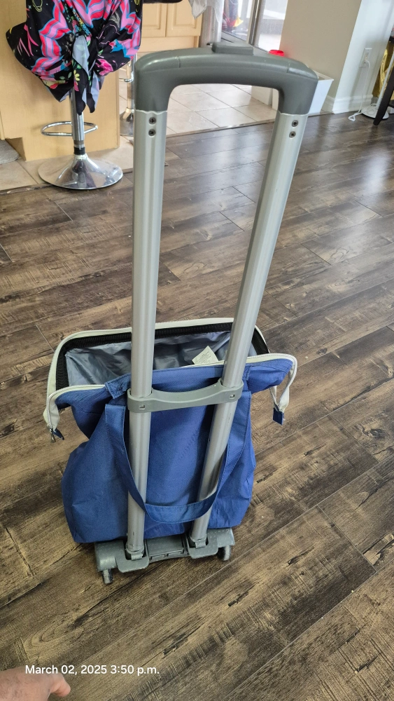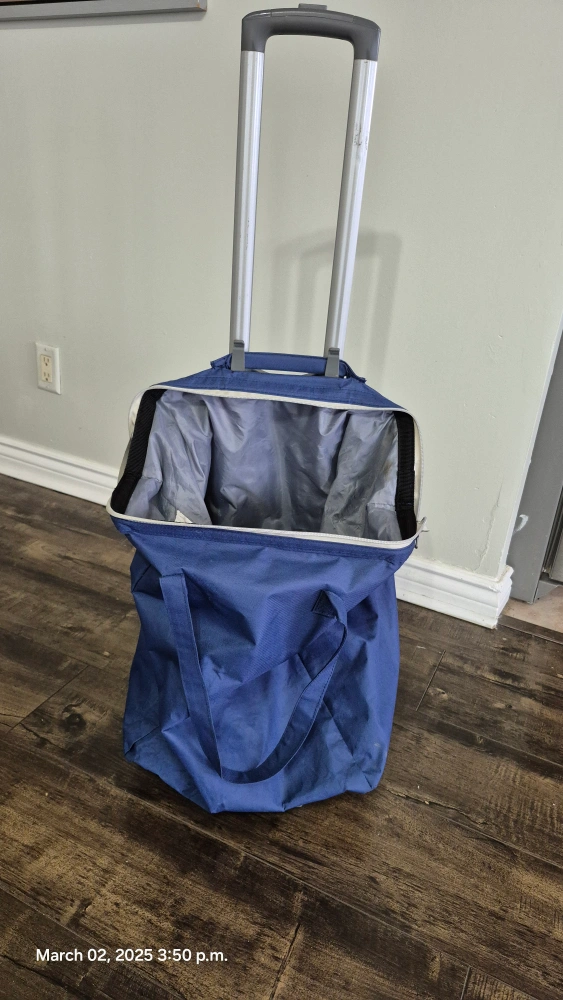 Blue shopping cart with telescoping handle. Features a zippered main compartment and additional carrying handles. Great for groceries or travel.