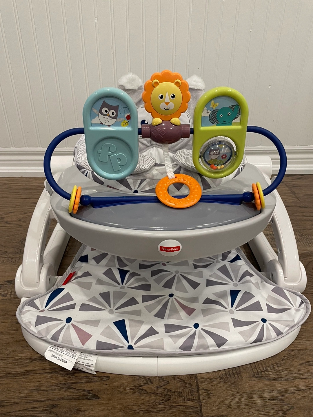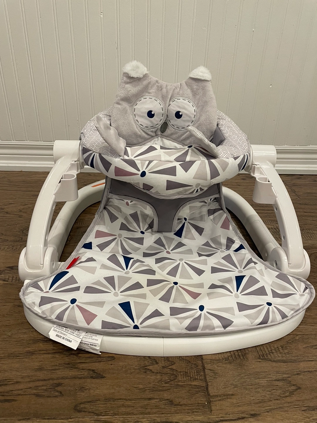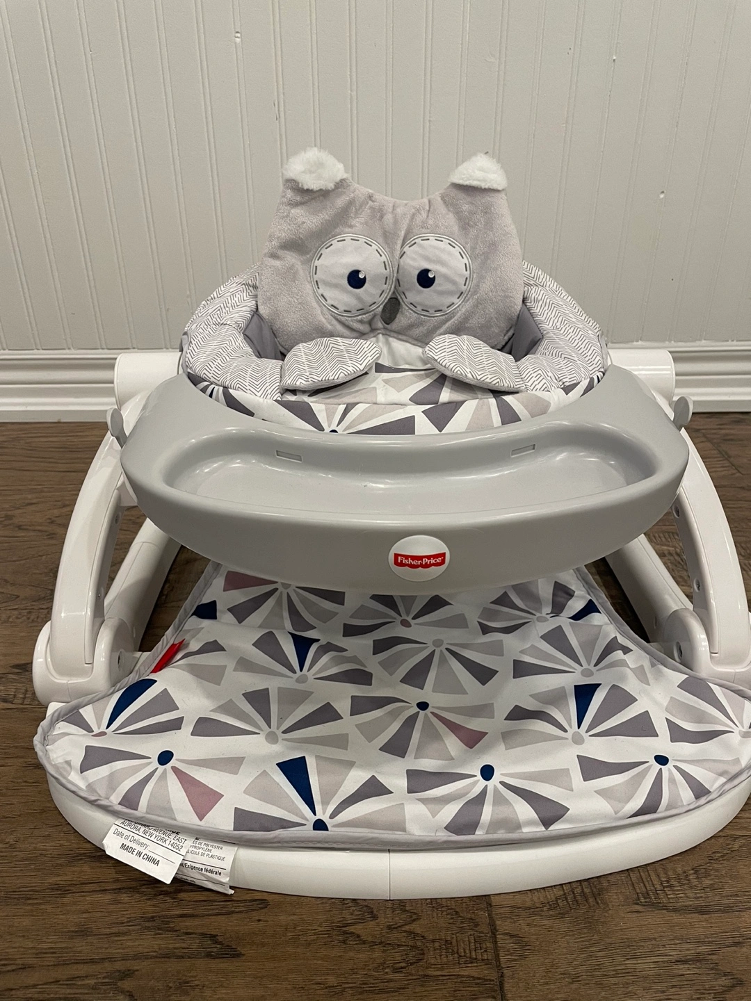 In excellent condition. Baby floor seat with tray. Features an owl design and various toys. Suitable for infants. Grey and white colour scheme. Collapses for easy storage.