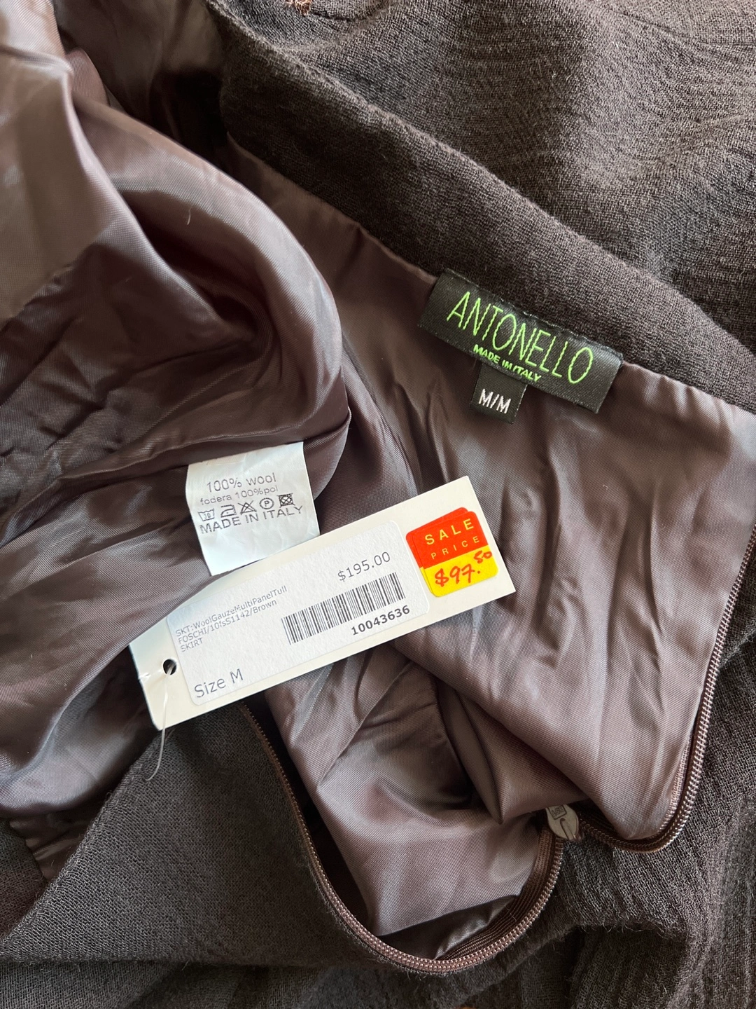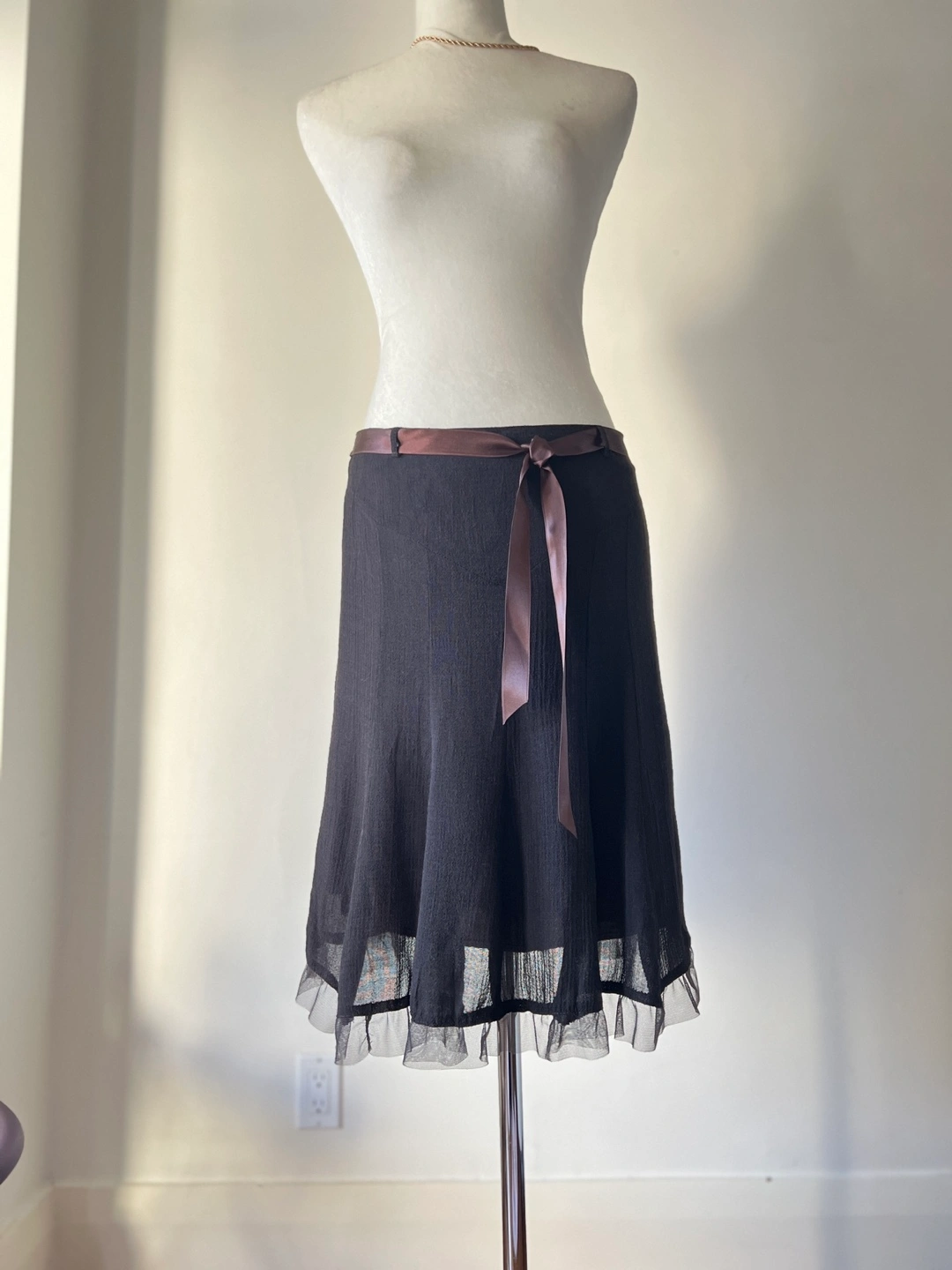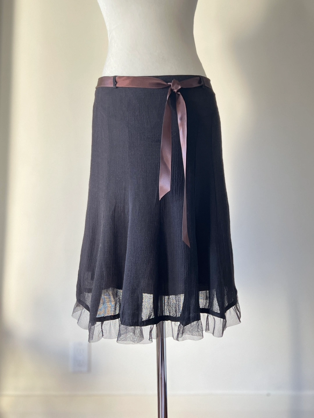Luxury designer. Made in Italy. New with tags/Never worn. A-line skirt. Dark brown colour. Features a satin belt that ties in a bow. Sheer, ruffled hem. 100% wool. Size Medium. See photos for measurements.
