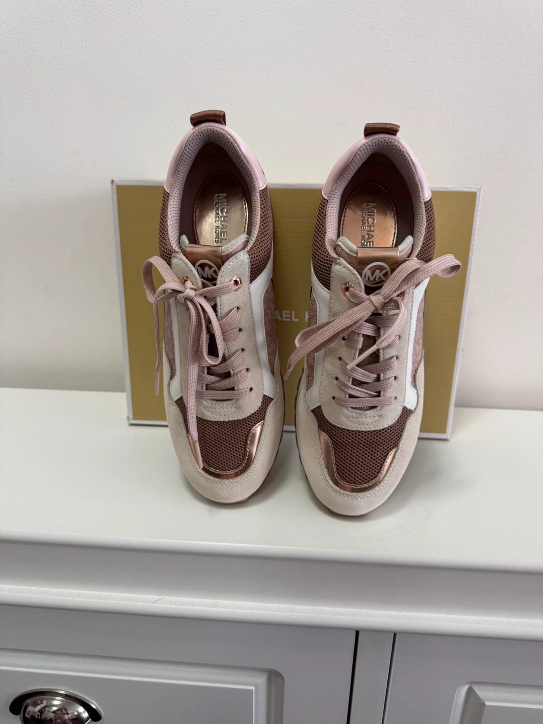 Beautiful Women's Michael Kors Shoes . Size 8M. Soft pink and rose gold colour scheme. Suede and mesh upper. Rose gold accents. Comes in original box. Worn only once, I really like this very much and sad for me to let it go but its tight for me as my feet is wide and and I an also flat footed. Pick up at Bathurst & Steeles.