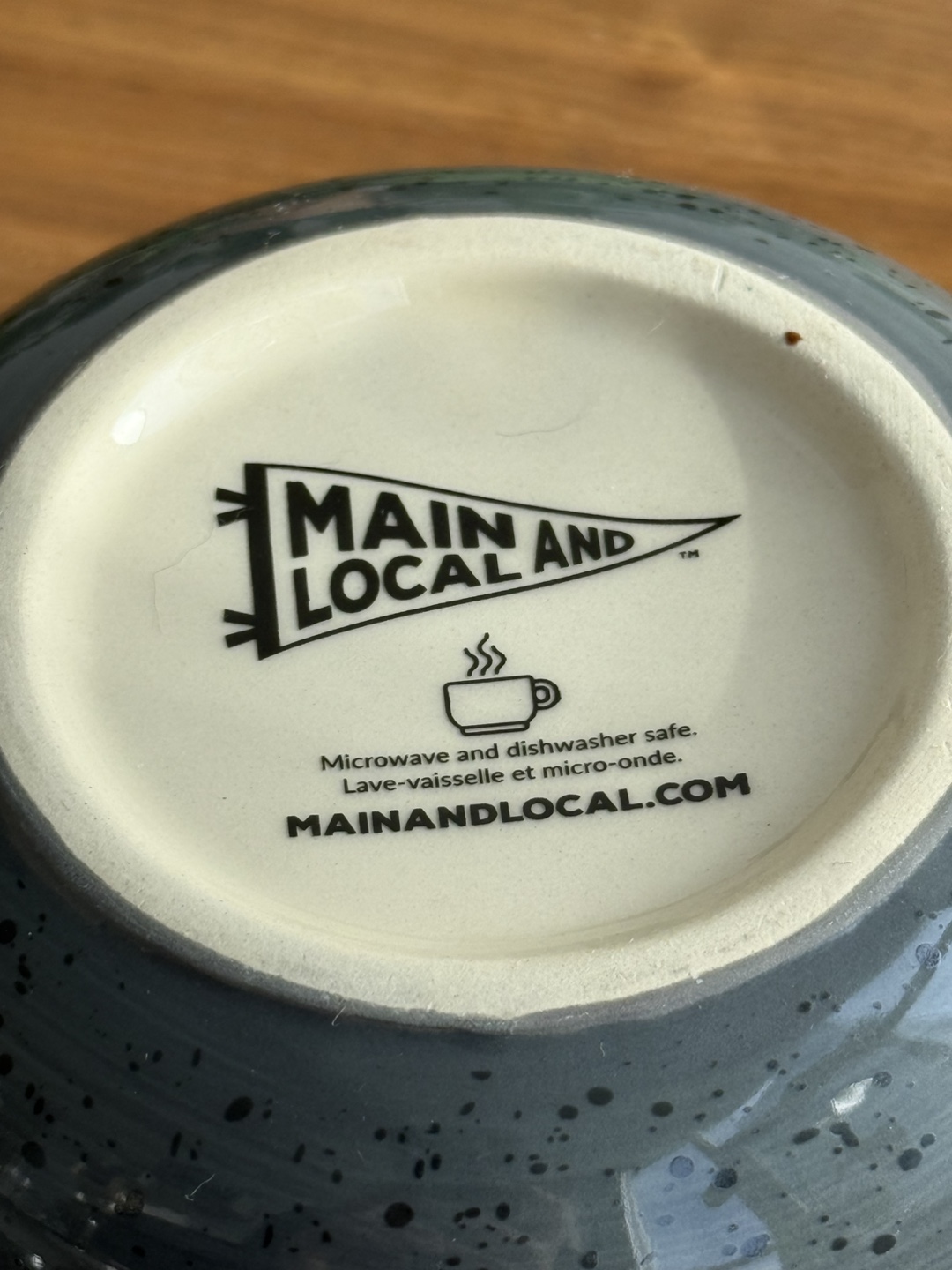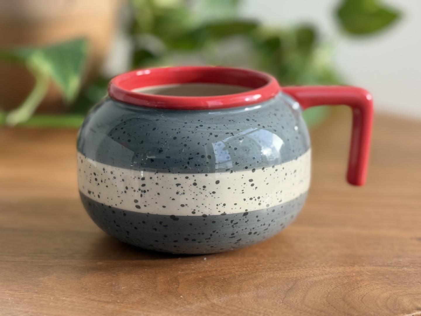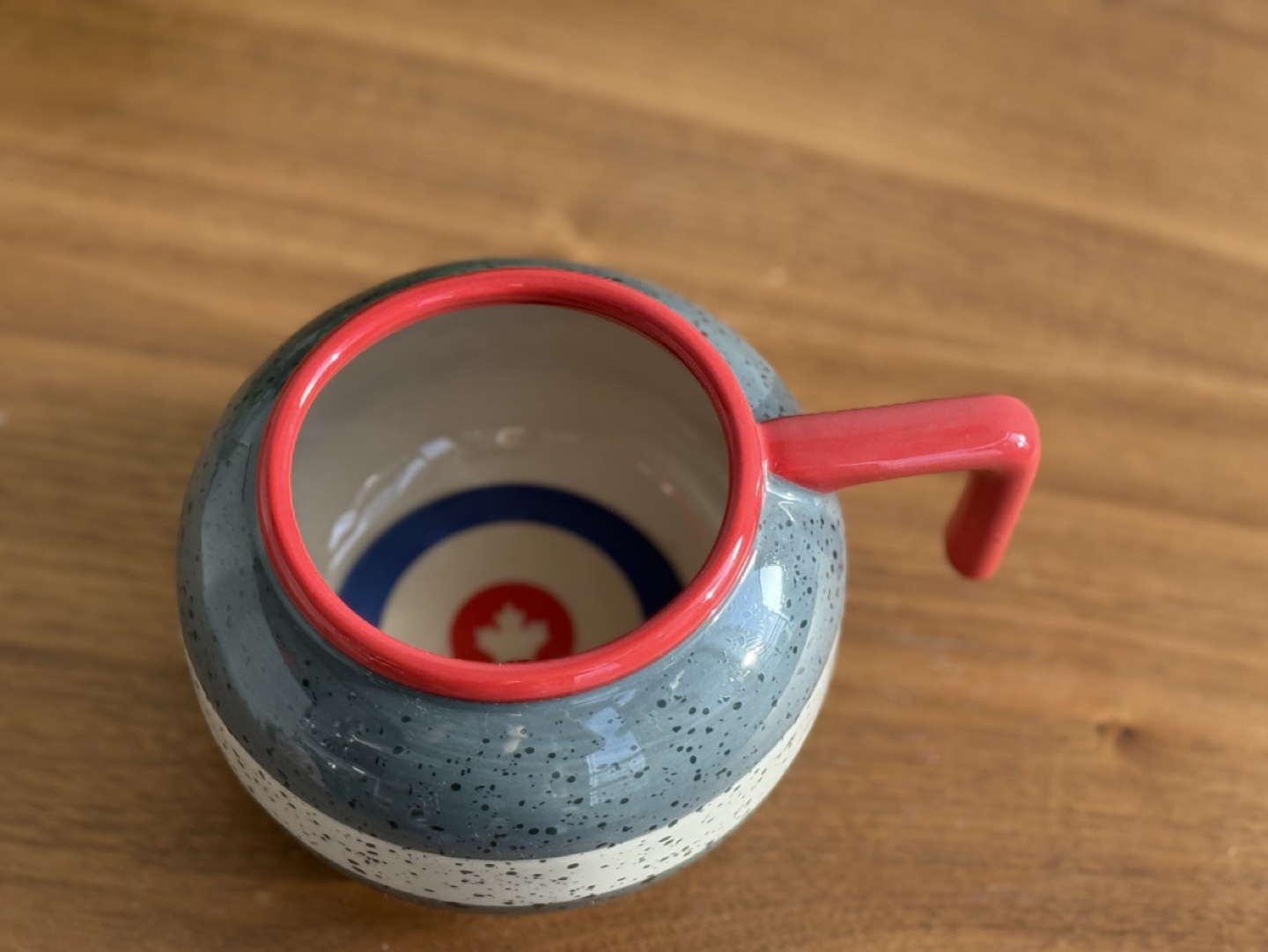 Unique curling stone mug. Grey and red. Microwave and dishwasher safe. Speckled design. Red interior and handle.