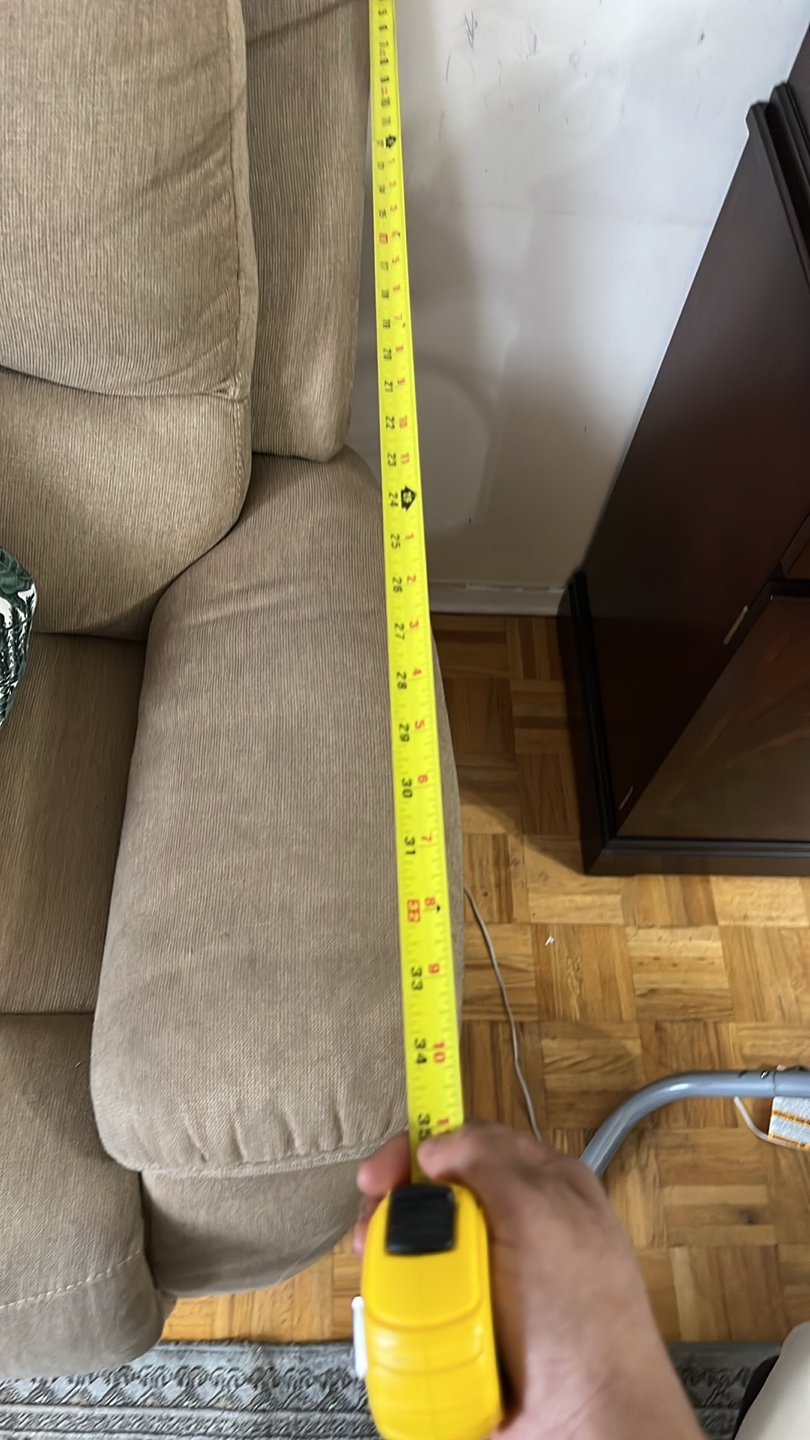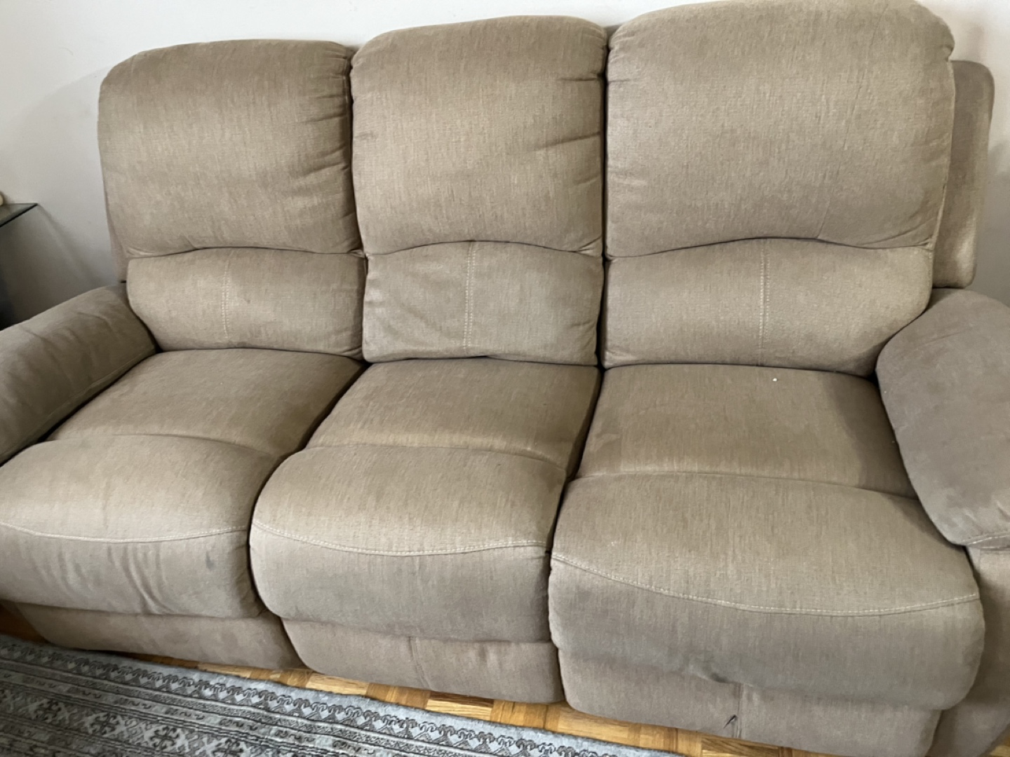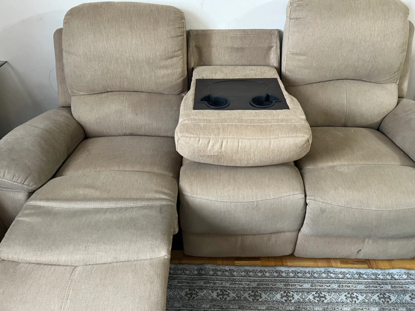 Beige fabric reclining sofa. Features a centre console with cup holders. Approximately 68" wide and 38" tall. Used condition.