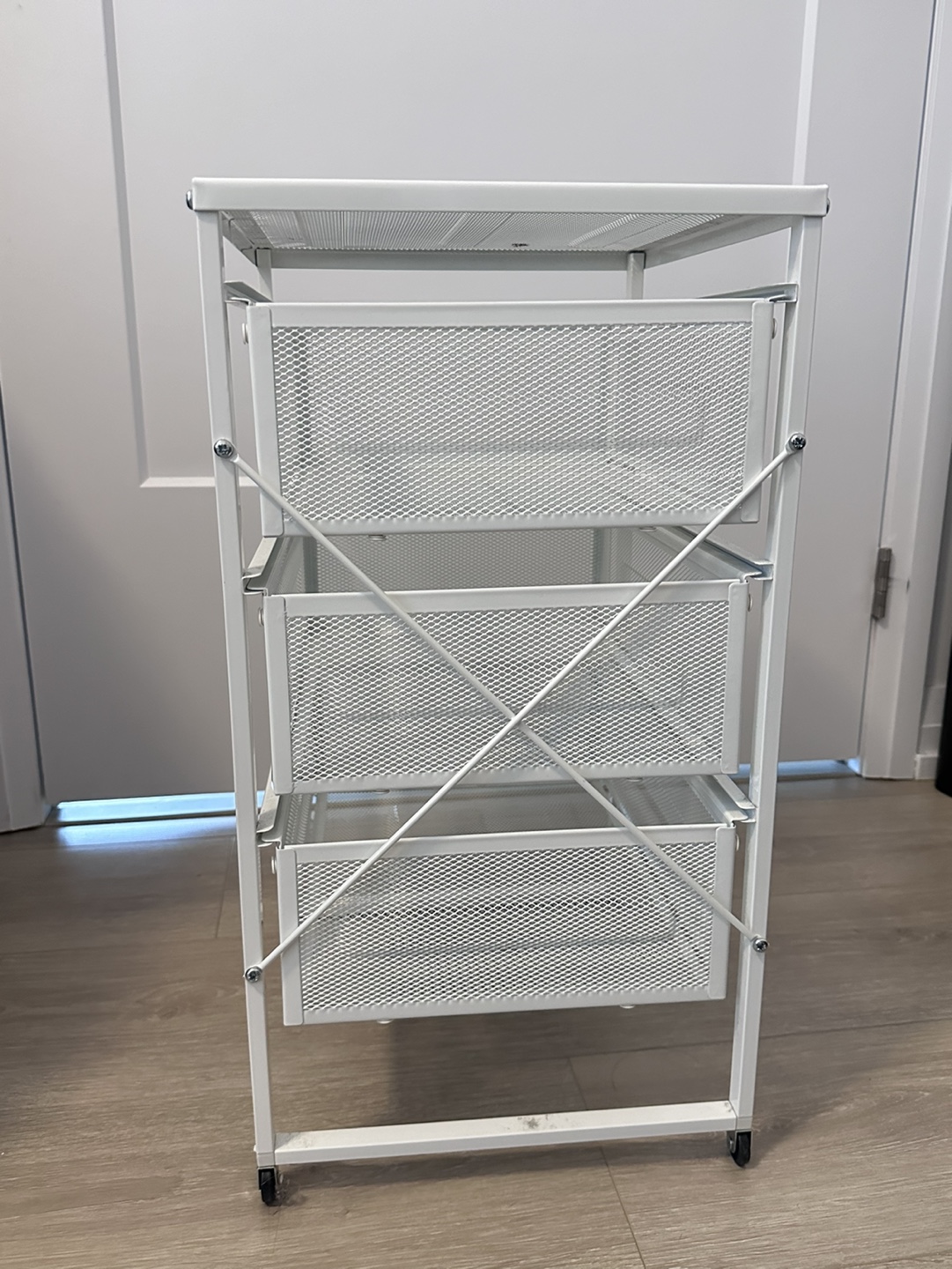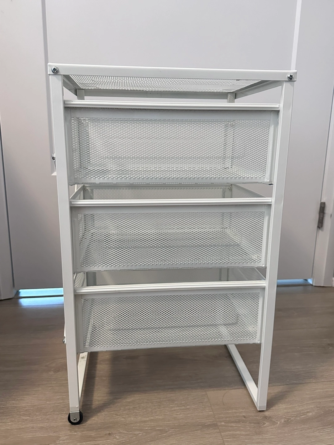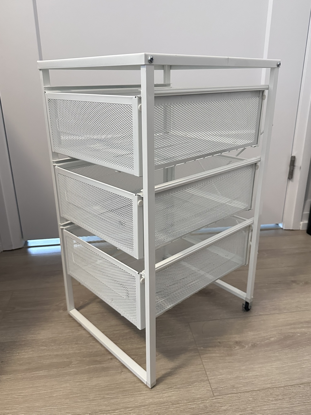Three-drawer rolling cart. Wheels only on the back. Metal frame and mesh drawers. Great for organizing small items. Minor small spot on the top