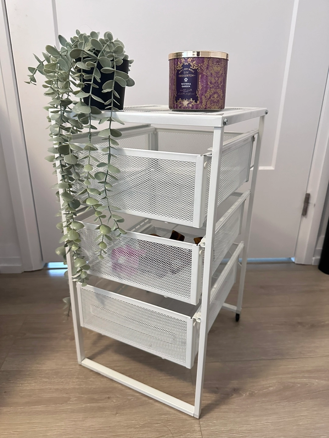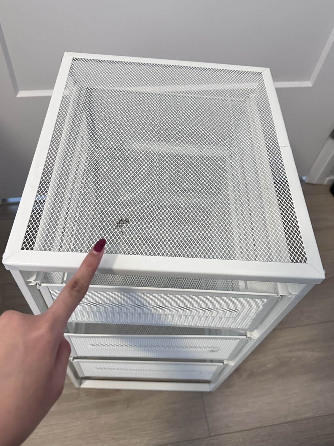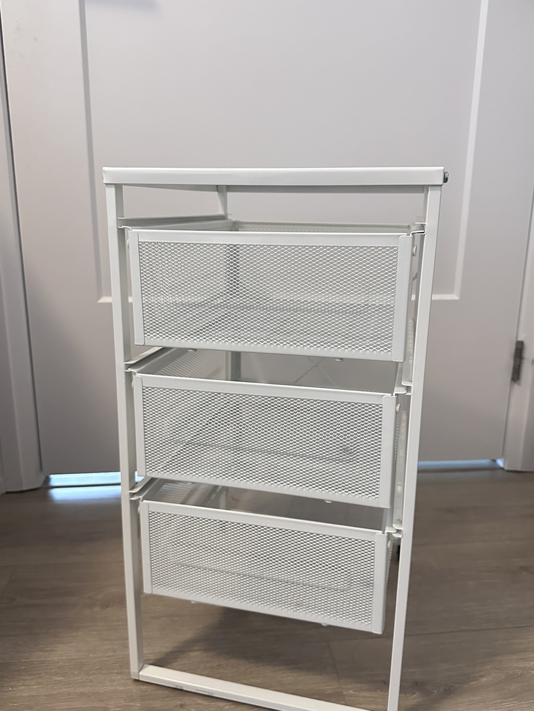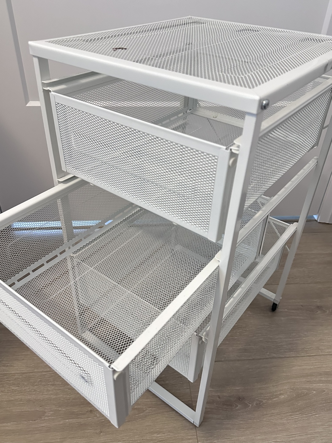 Three-drawer rolling cart. Wheels only on the back. Metal frame and mesh drawers. Great for organizing small items. Minor small spot on the top