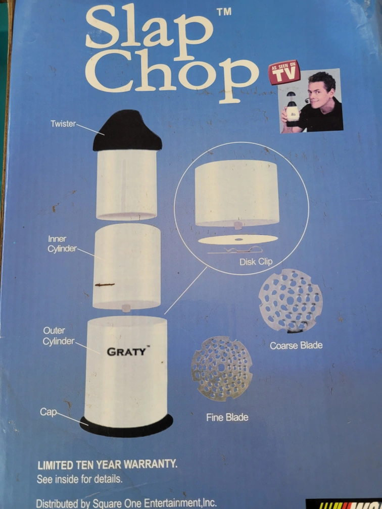 comes with box and replacement blades. Includes food chopper and grater. Perfect for chopping vegetables, nuts, and more. Easy to use and clean. used but in good shape