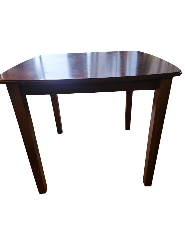 Small square coffee table. Brown wood finish. Some minor scratches and wear. Solid wood legs. Good condition overall.