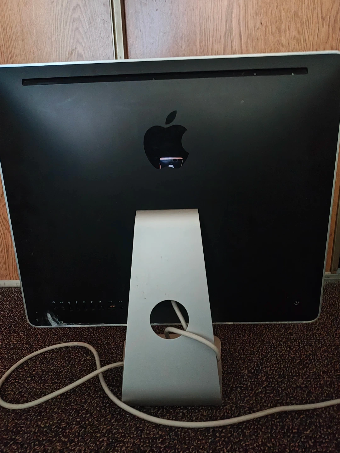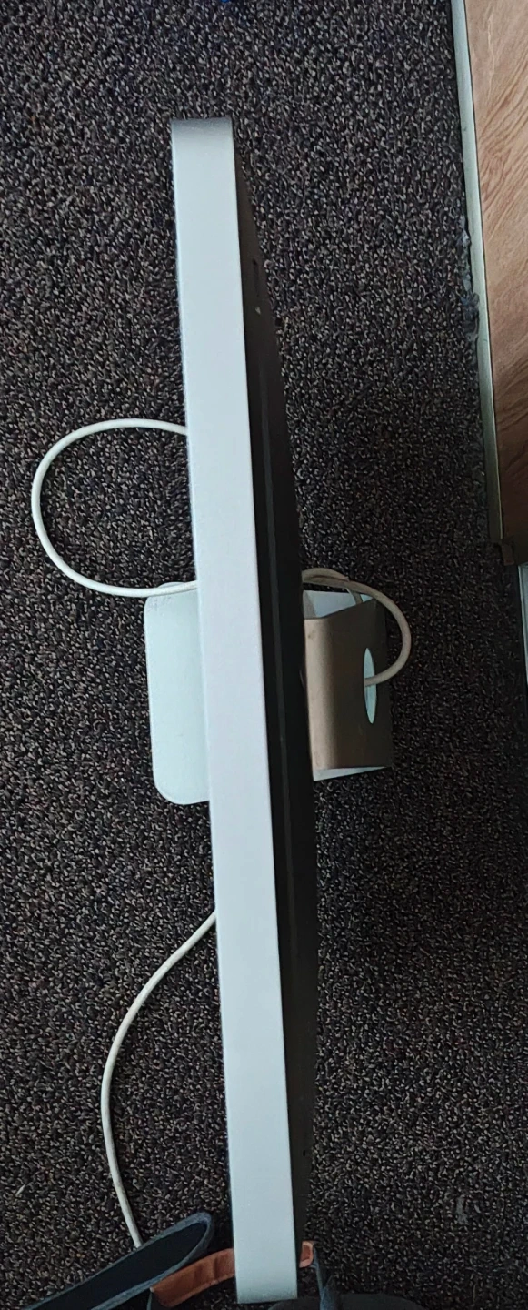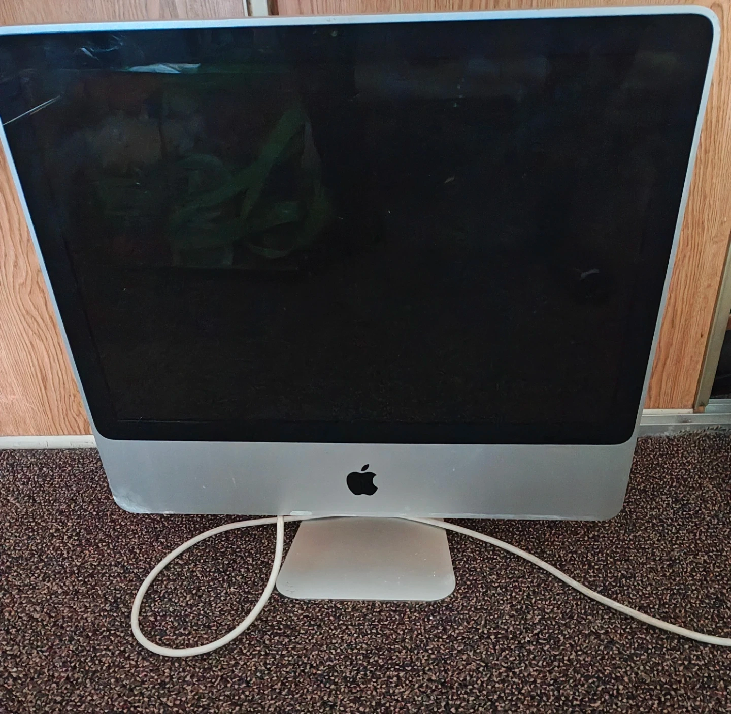 This is an Apple iMac desktop computer. It features a large display and integrated components. The unit has a stand and comes with a power cable.