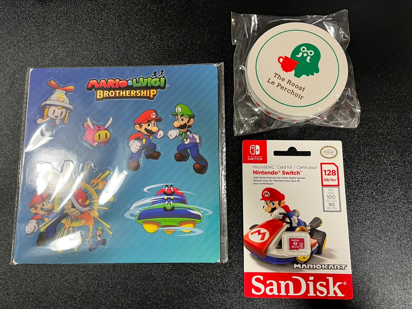 Comes with a set of Animal Crossing coasters (new in tin) and Mario and Luigi: Brothership magnets (new in package)