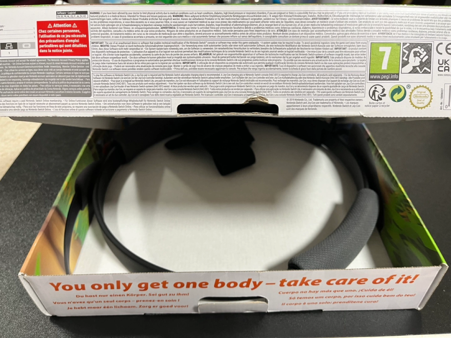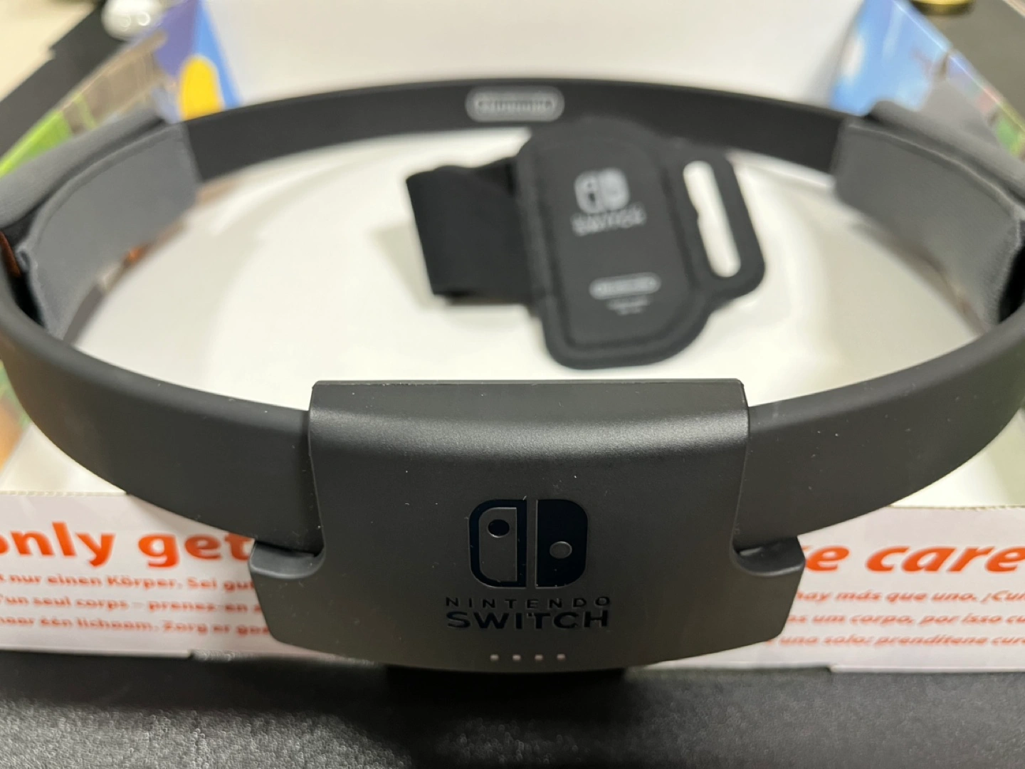 Nintendo Switch Ring Fit Adventure game, Ring-con, and leg strap.