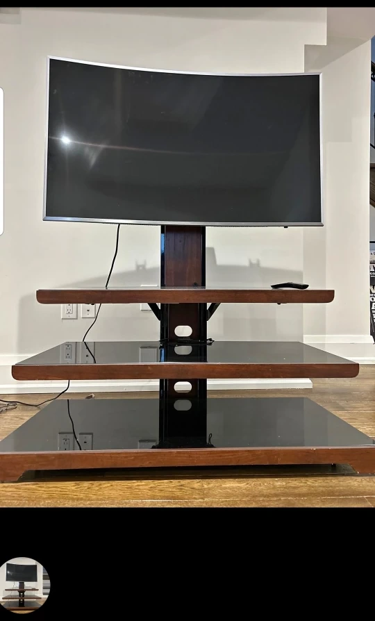 Three-shelf TV stand. Dark wood frame. Glass shelves. Supports flat and curved screen TVs. Excellent condition. no scratches I can deliver locally for the cost of gas