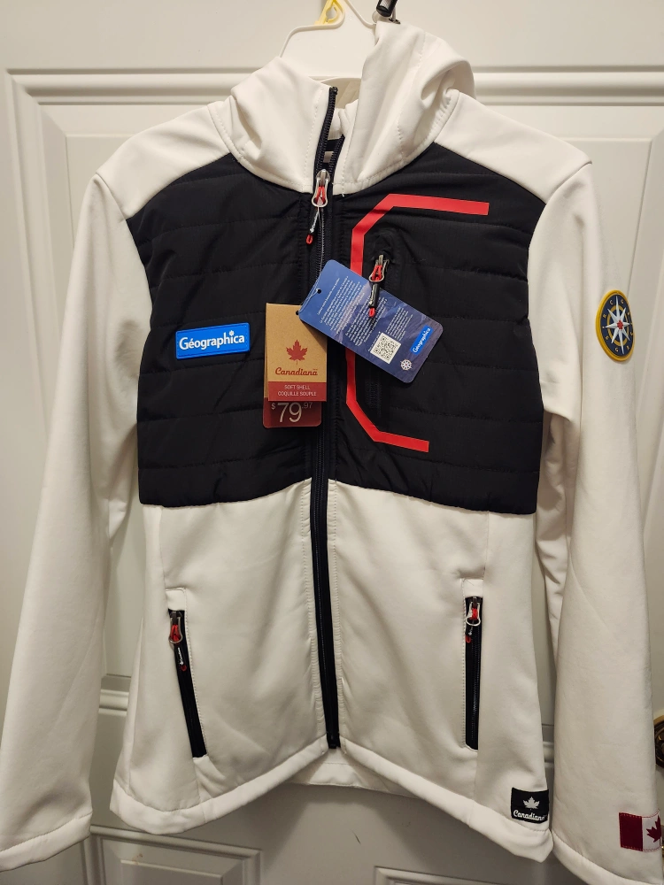 brand new. gorgeous white color. .Women's size small soft shell jacket. White, black and red colour block design. Features a hood and zippered pockets. New with tags. perfect for spring. great for girls or ladies. with Canadian flag on the wrist and nice patches purchased price $80+ tax but selling for much less tags: nike lululemon tna canada goose adidas reebok roots fila converse puma under armour columbia north face eddie bauer