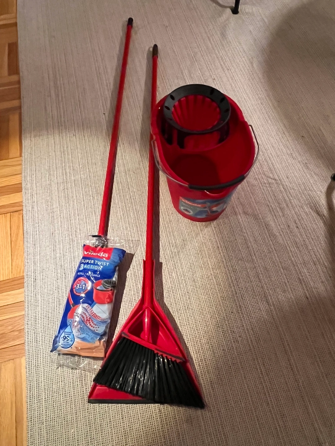 Vileda Quick Wring mop bucket with Super Twist mop refill and broom.