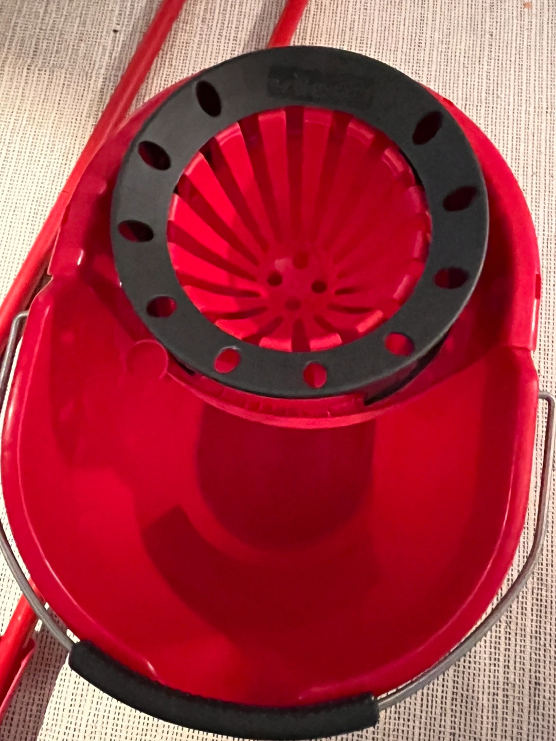 Red plastic bucket with easy wring system.