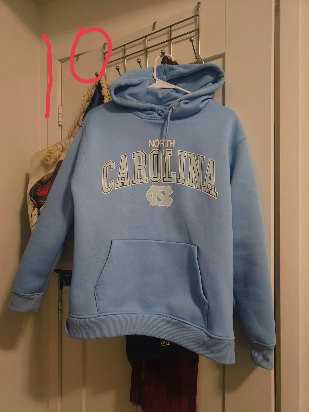 Soft light blue hoodie. Features a large North Carolina graphic on the chest. Long sleeves, kangaroo pocket. Great for casual wear.