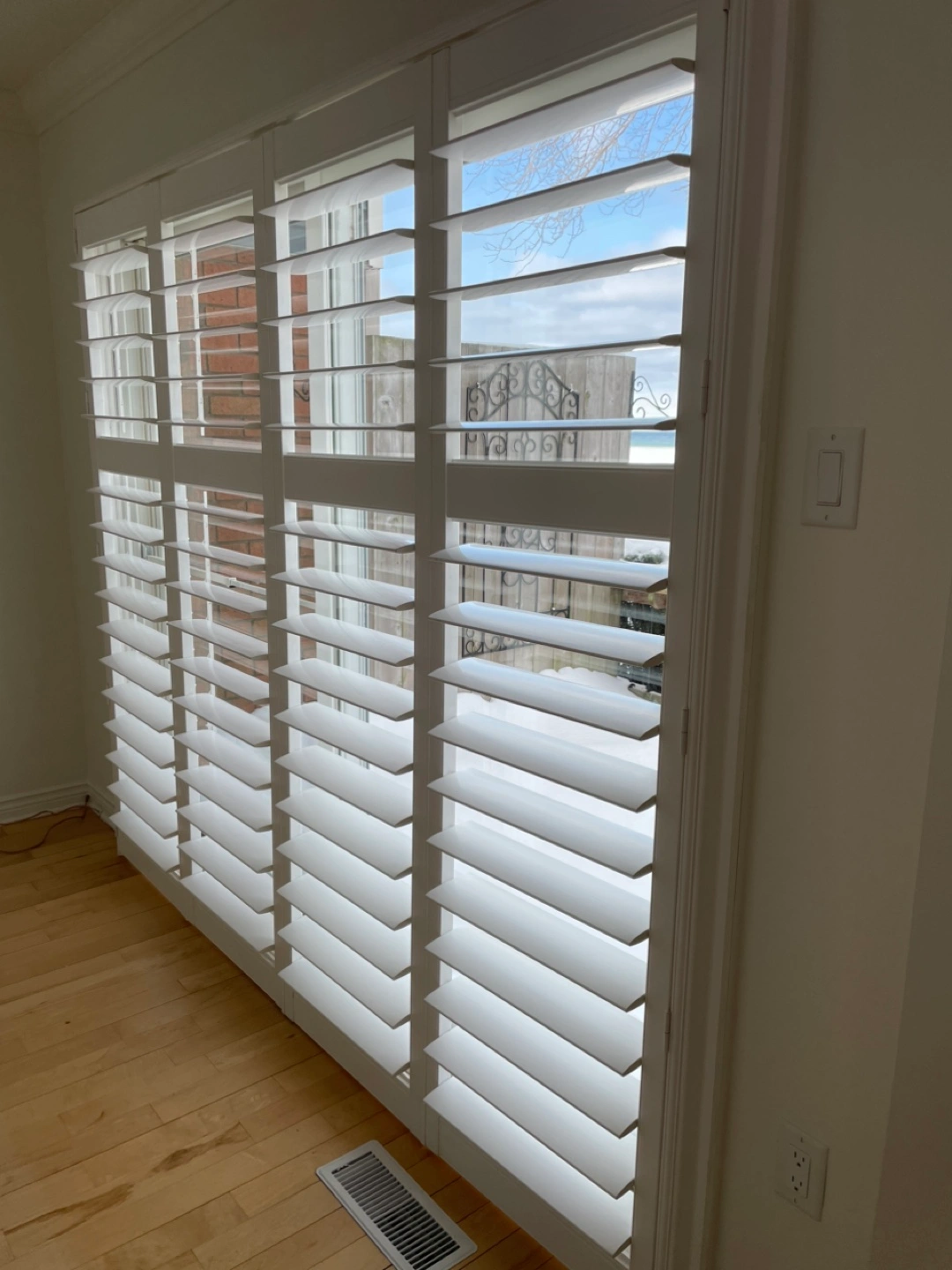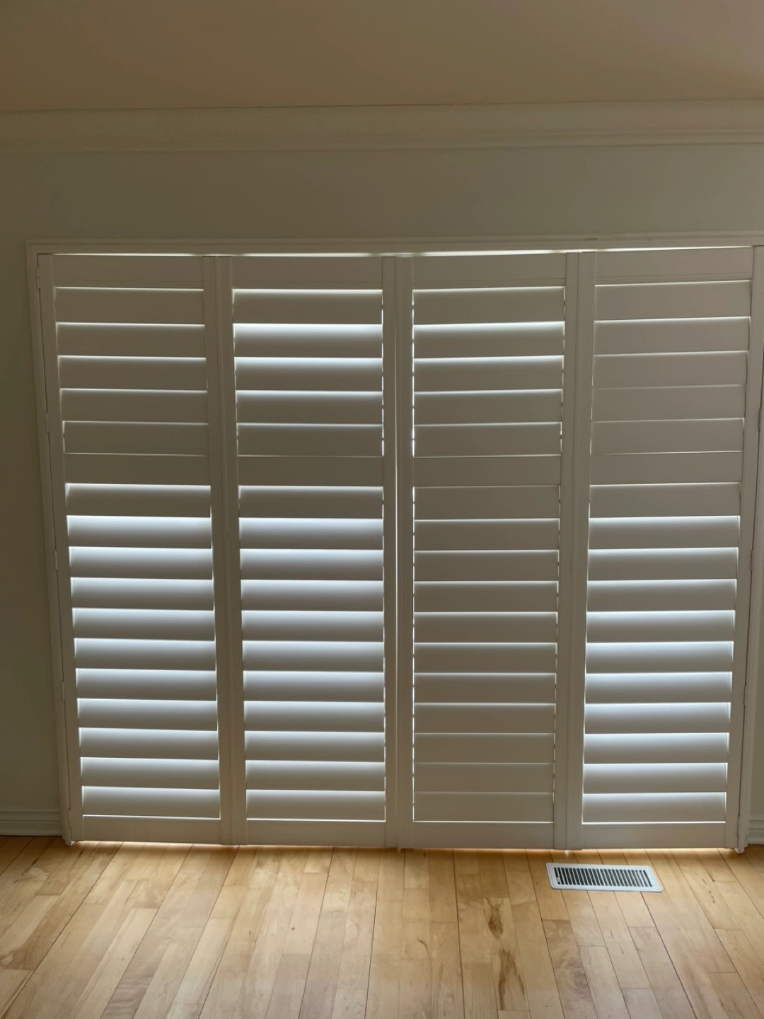 Four-panel sliding door shutters. White finish. Excellent condition. Custom-made for a specific door size. Easy to operate. Adds privacy and light control.