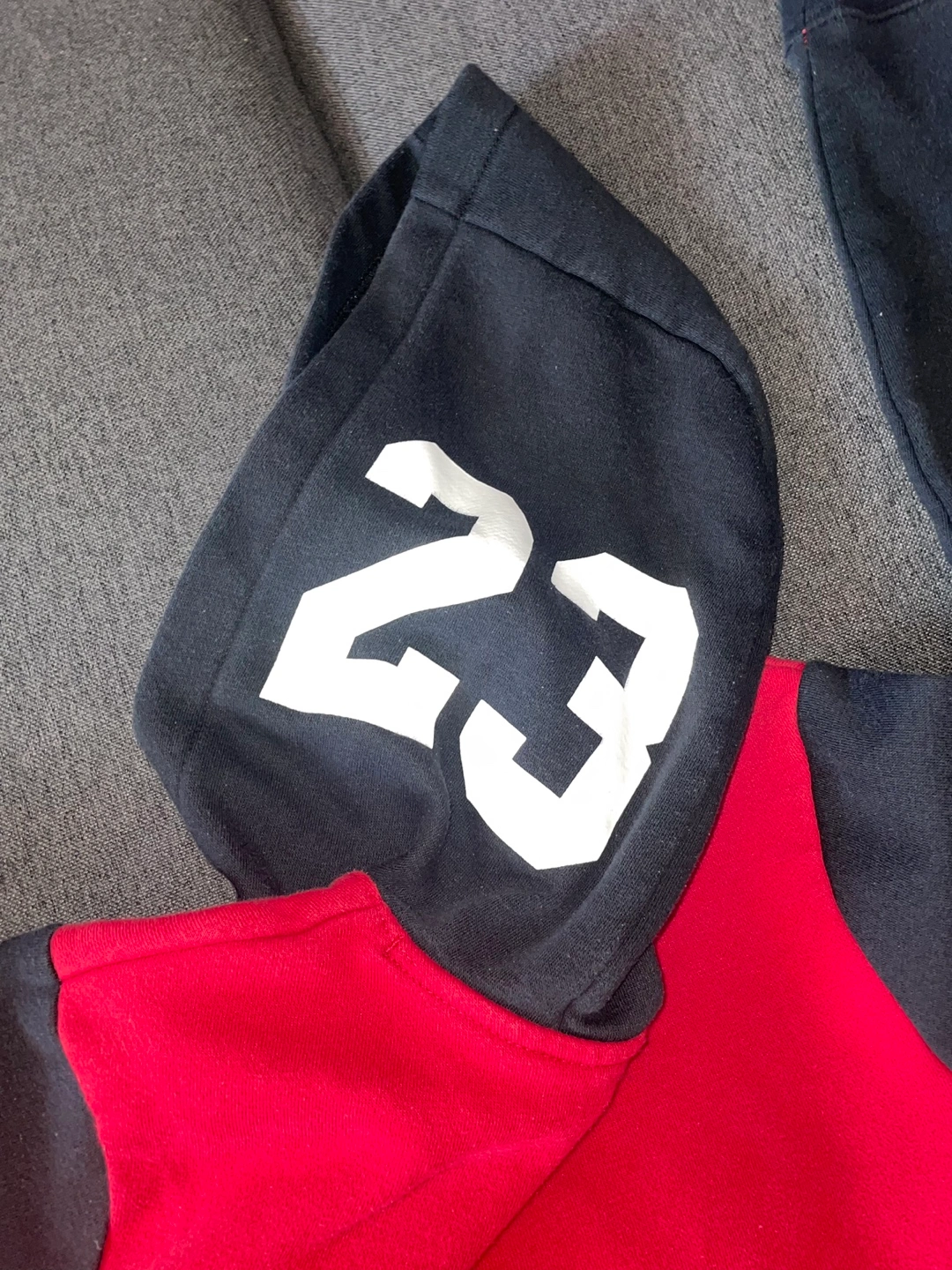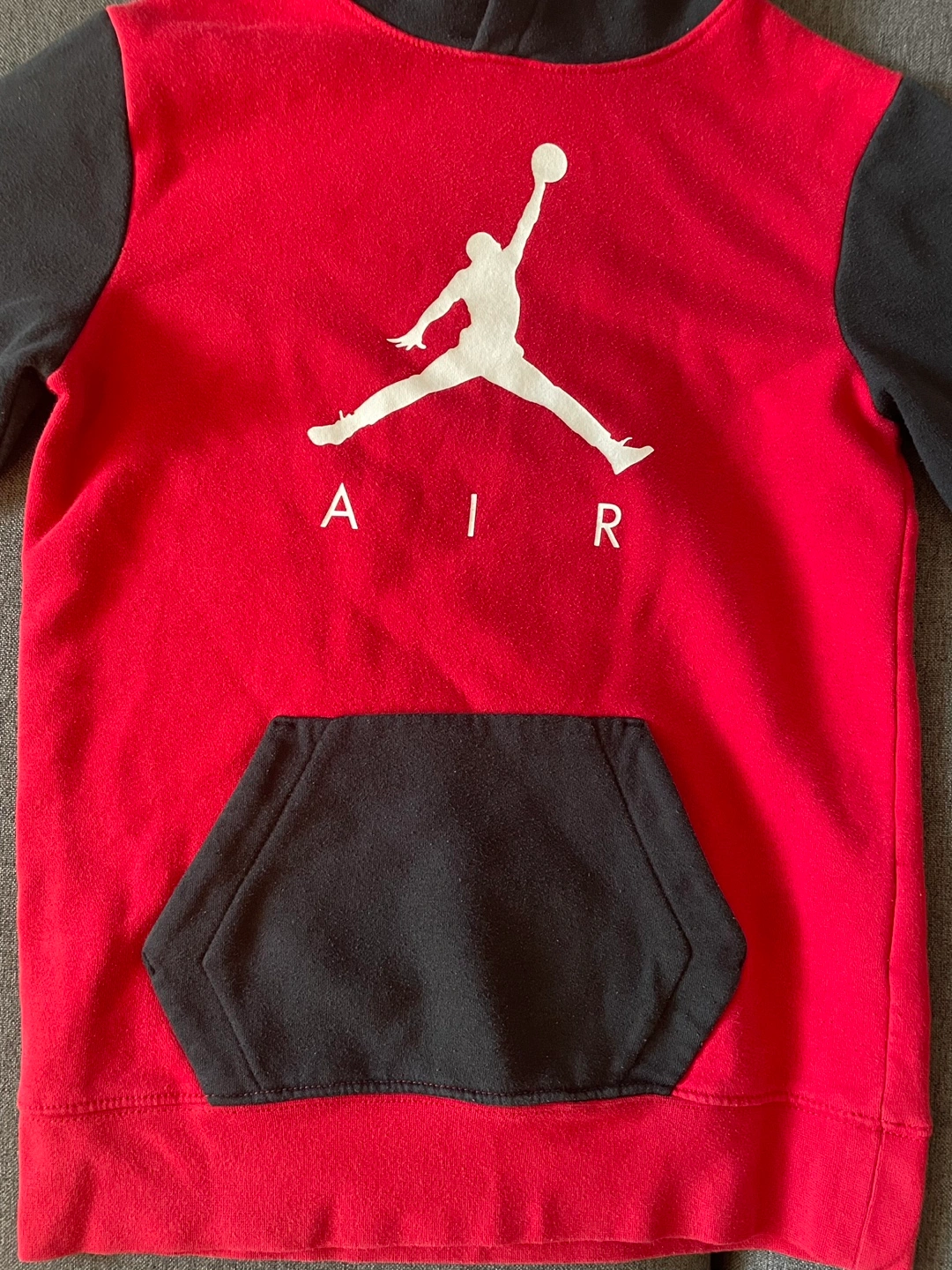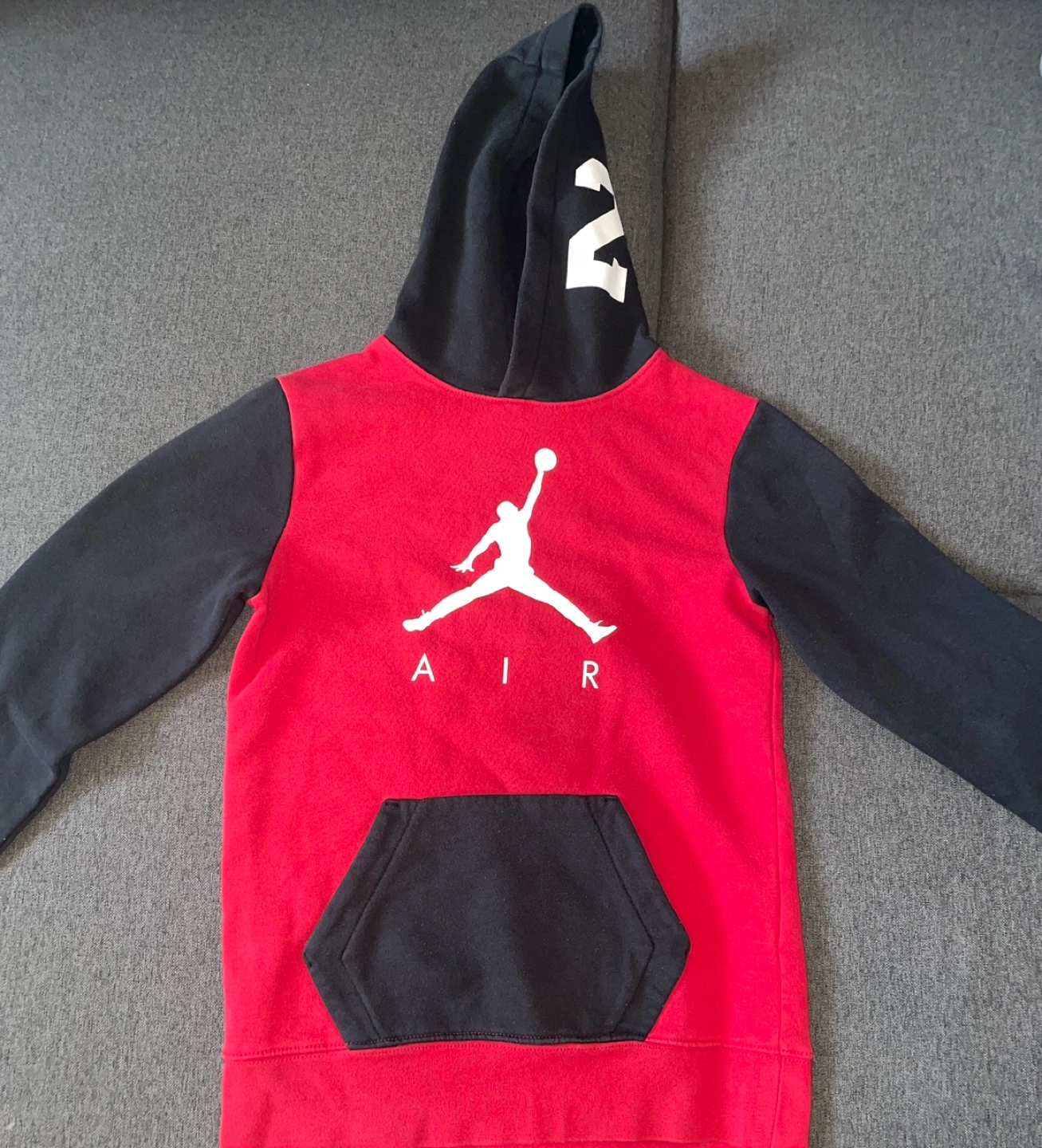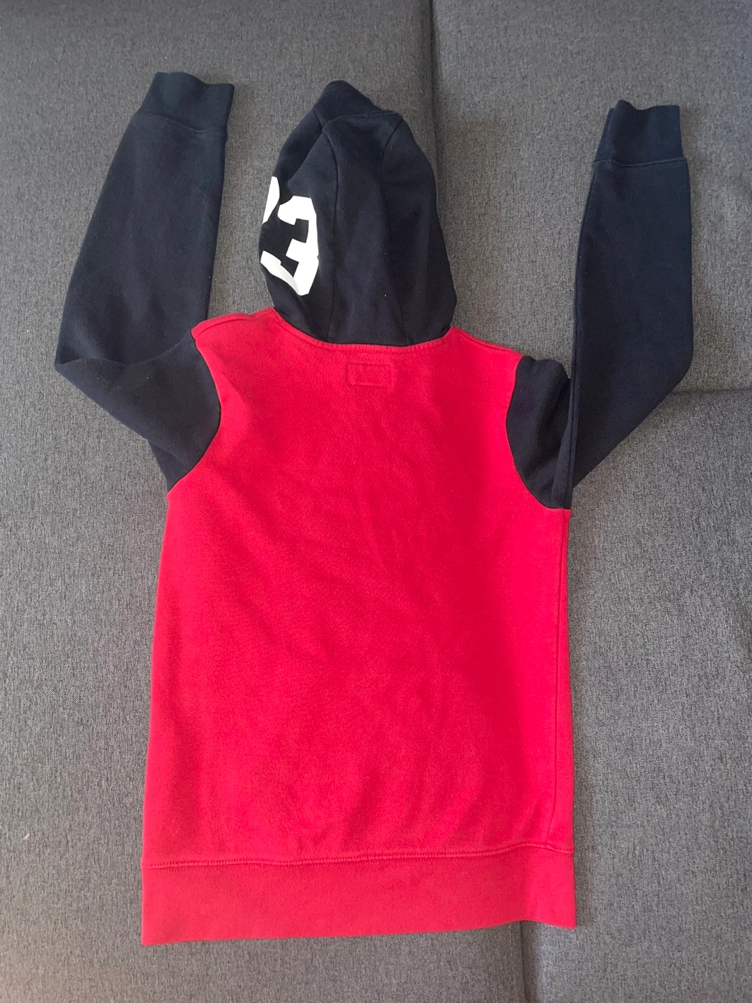 Red and black Jordan hoodie. 23 on the hood. Long sleeves, kangaroo pocket. Size: CA/US L • 12-13yrs