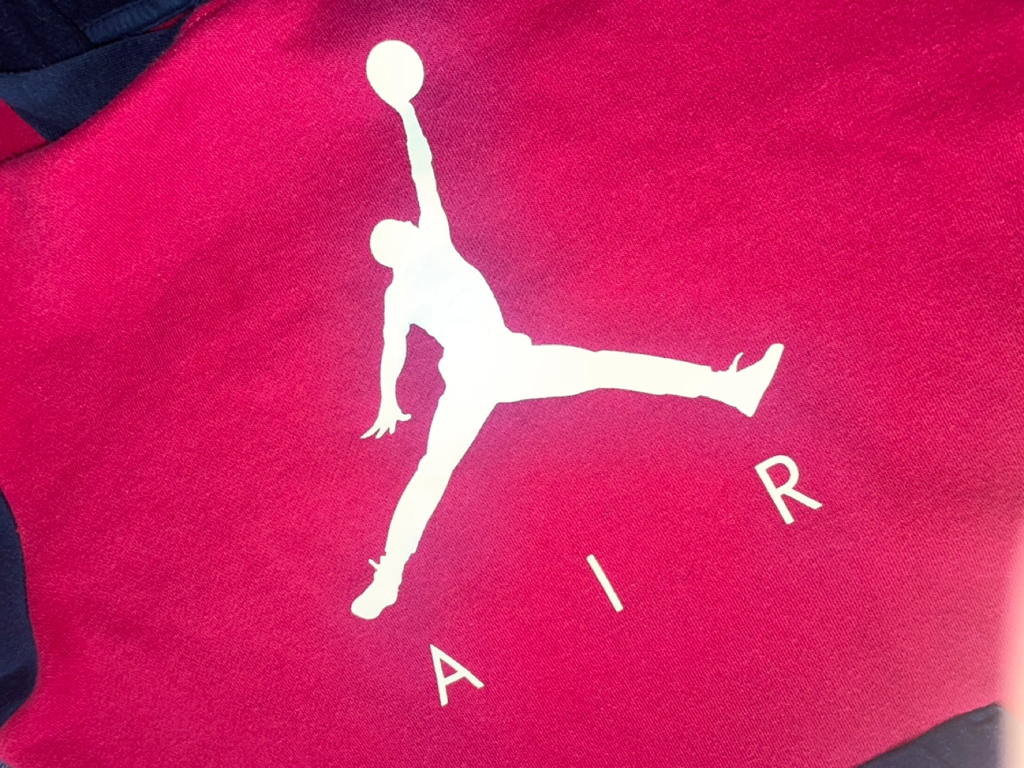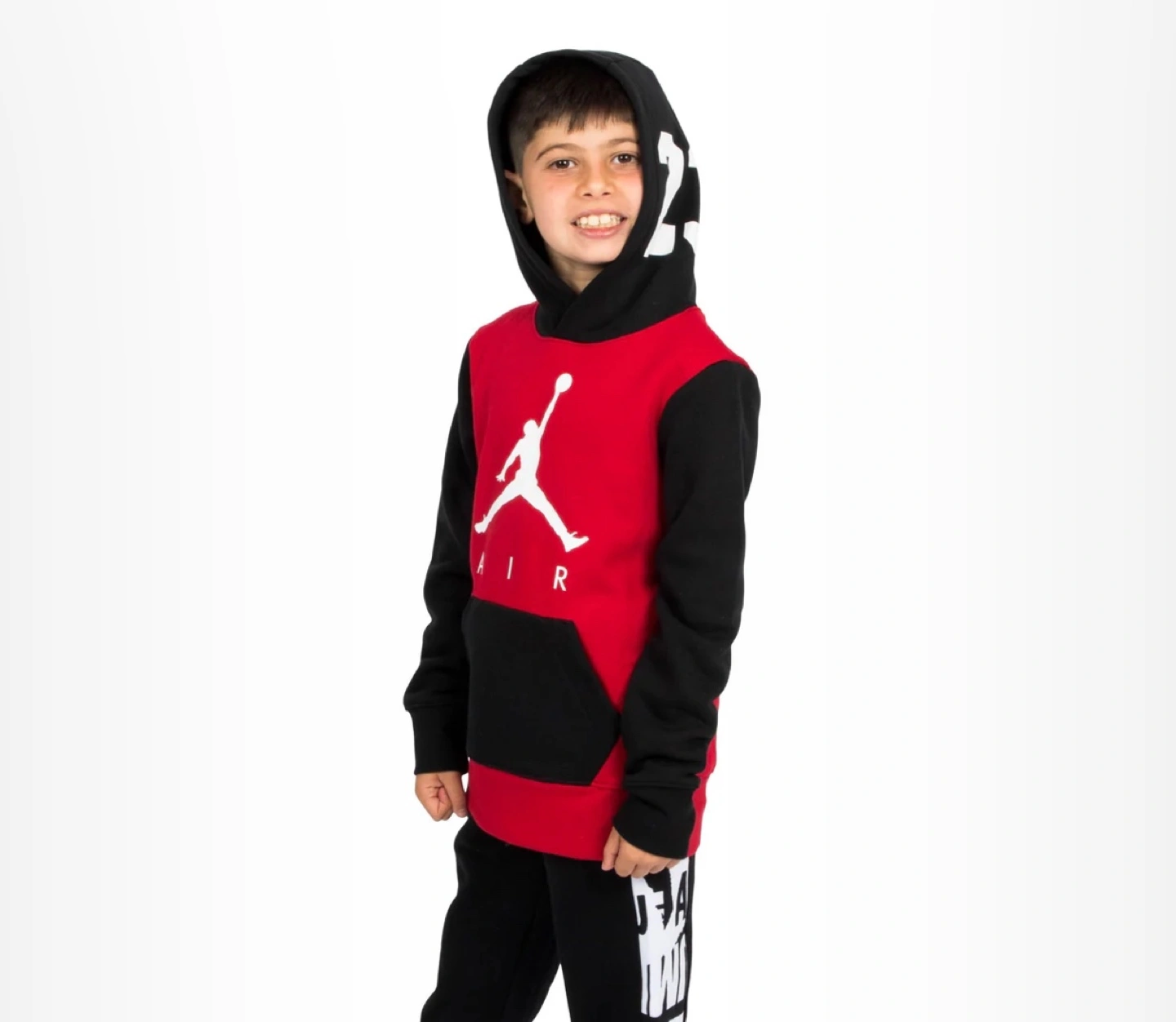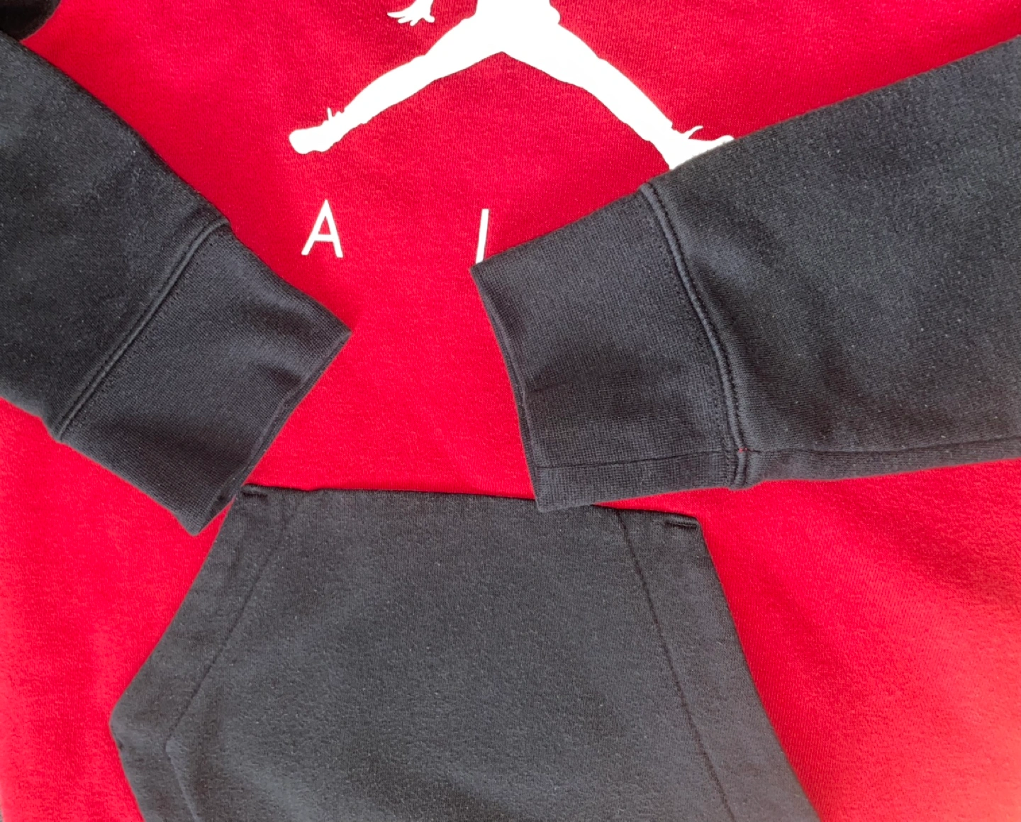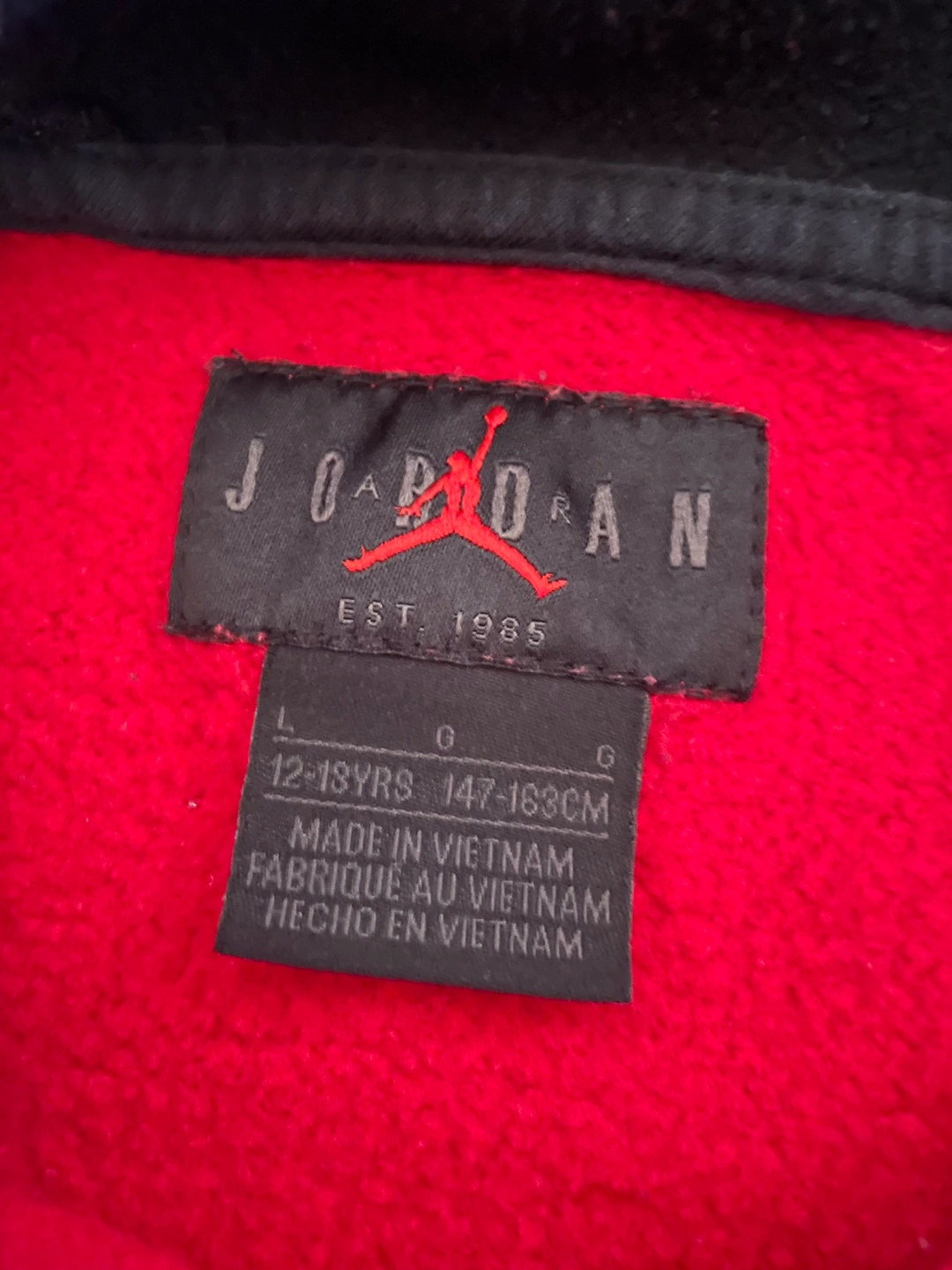 Red and black Jordan hoodie. 23 on the hood. Long sleeves, kangaroo pocket. Size: CA/US L • 12-13yrs