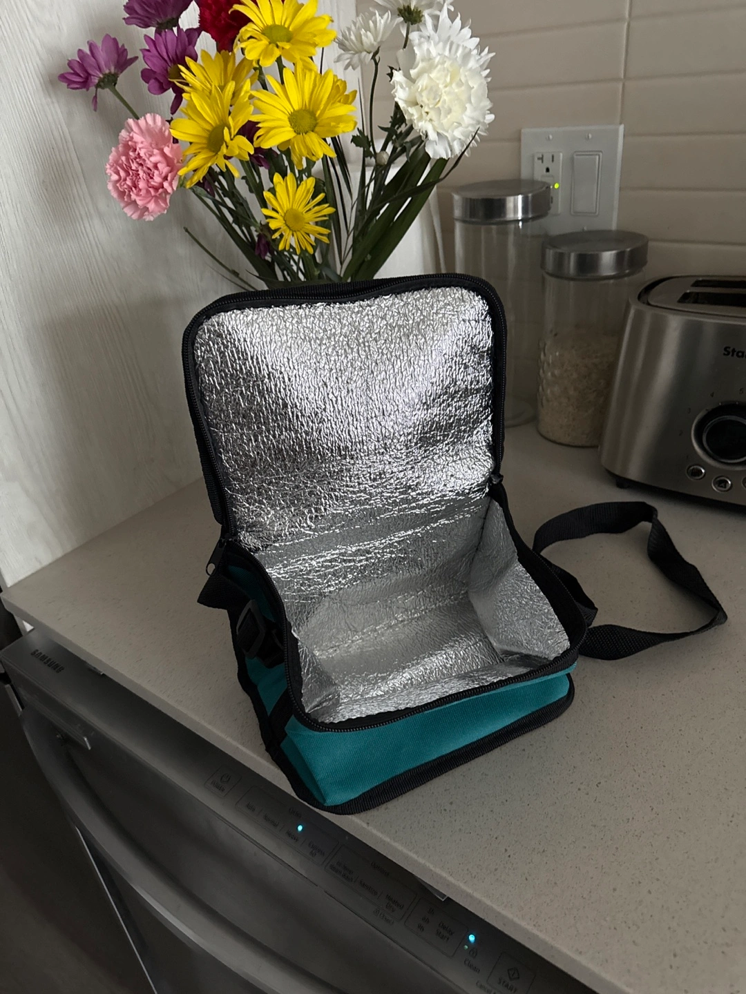 483Small teal lunch bag. Features a zipper closure and an adjustable shoulder strap. Insulated interior keeps food cool or warm. Perfect for work or school.